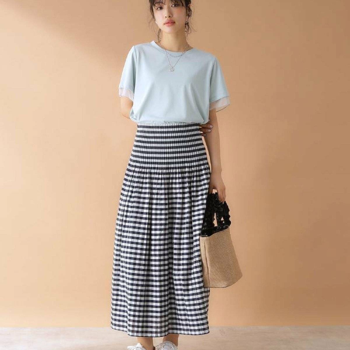 ミモレ丈のスカートにシャツやブラウスを合わせると、抜け感のないキチンとコーデに仕上がってしまいがちですが、Tシャツを合わせることで、今っぽいラフさをプラスすることができますよ。