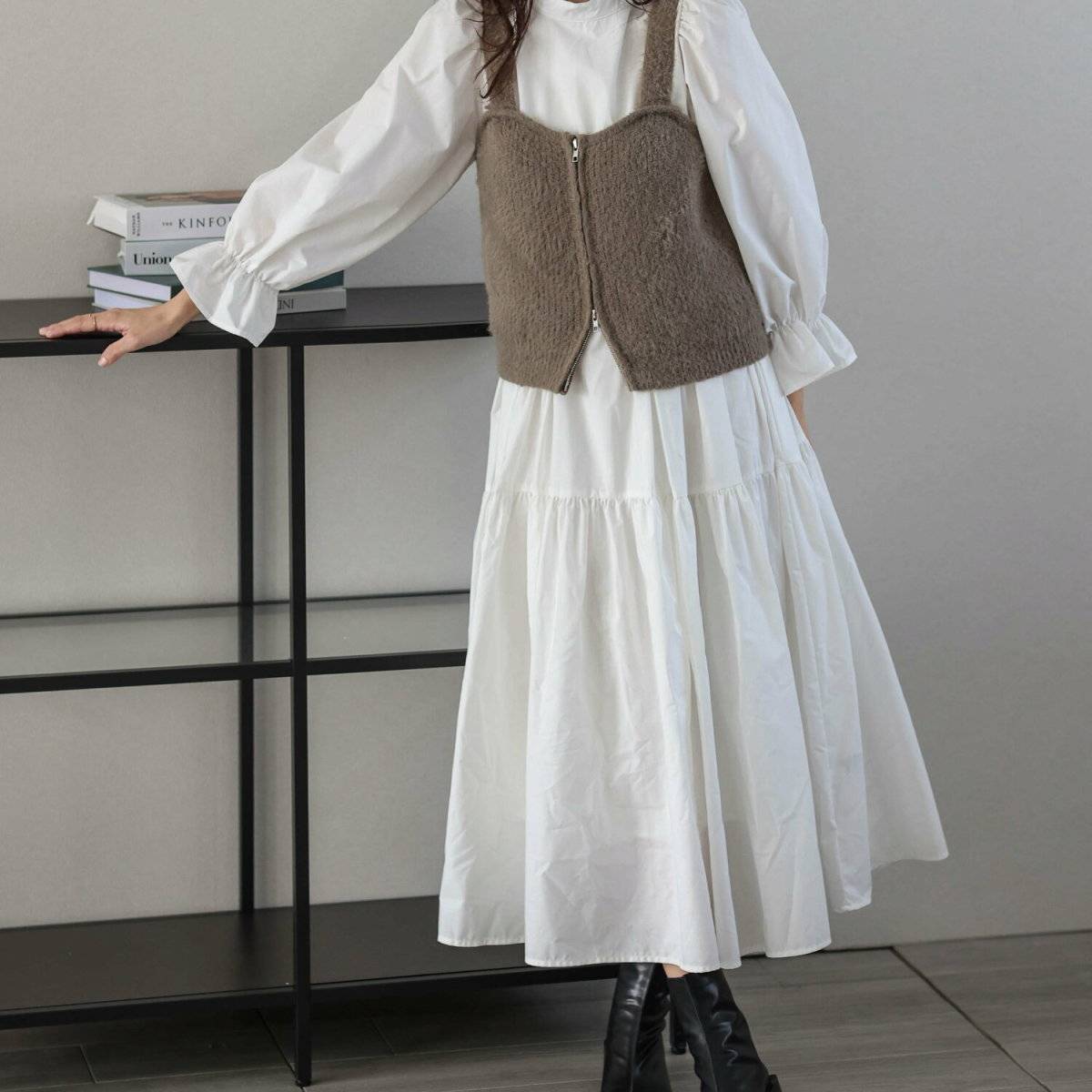 ブラウンのニットキャミソールは、白いティアードワンピースと重ねることで、おしゃれに着こなすことができます!