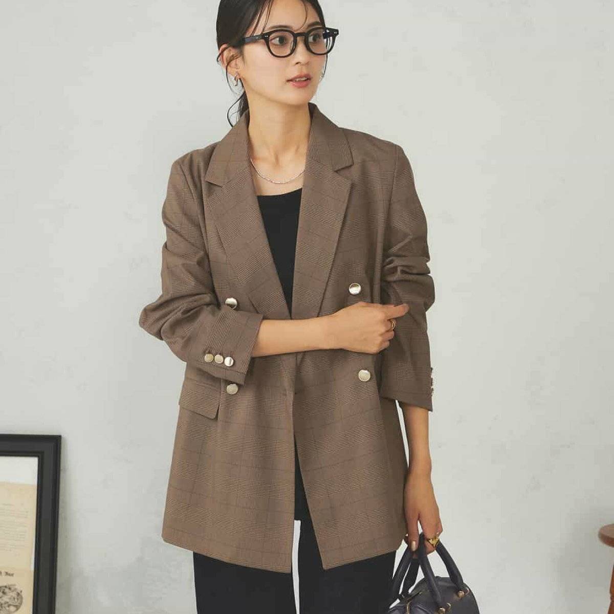 ジャケット×パンツのマニッシュなコーデには、メガネをアクセントにすることで、新鮮でどこかレトロな印象の着こなしに仕上がります。