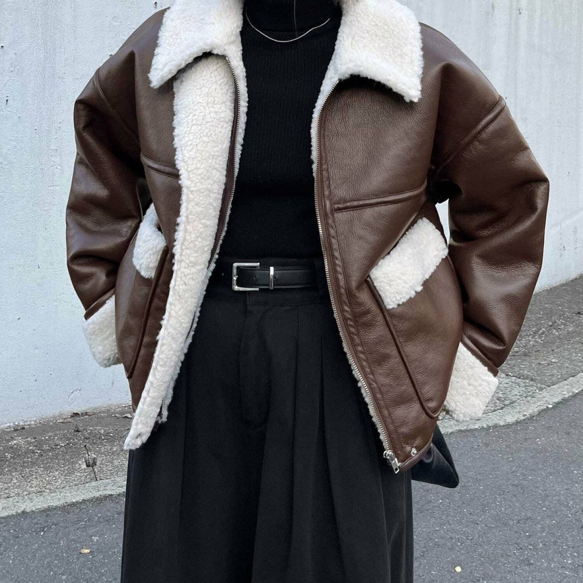 オールブラックコーデにブラウンのボアブルゾンを羽織り、おしゃれ上級者なコーデを楽しんでみてください。