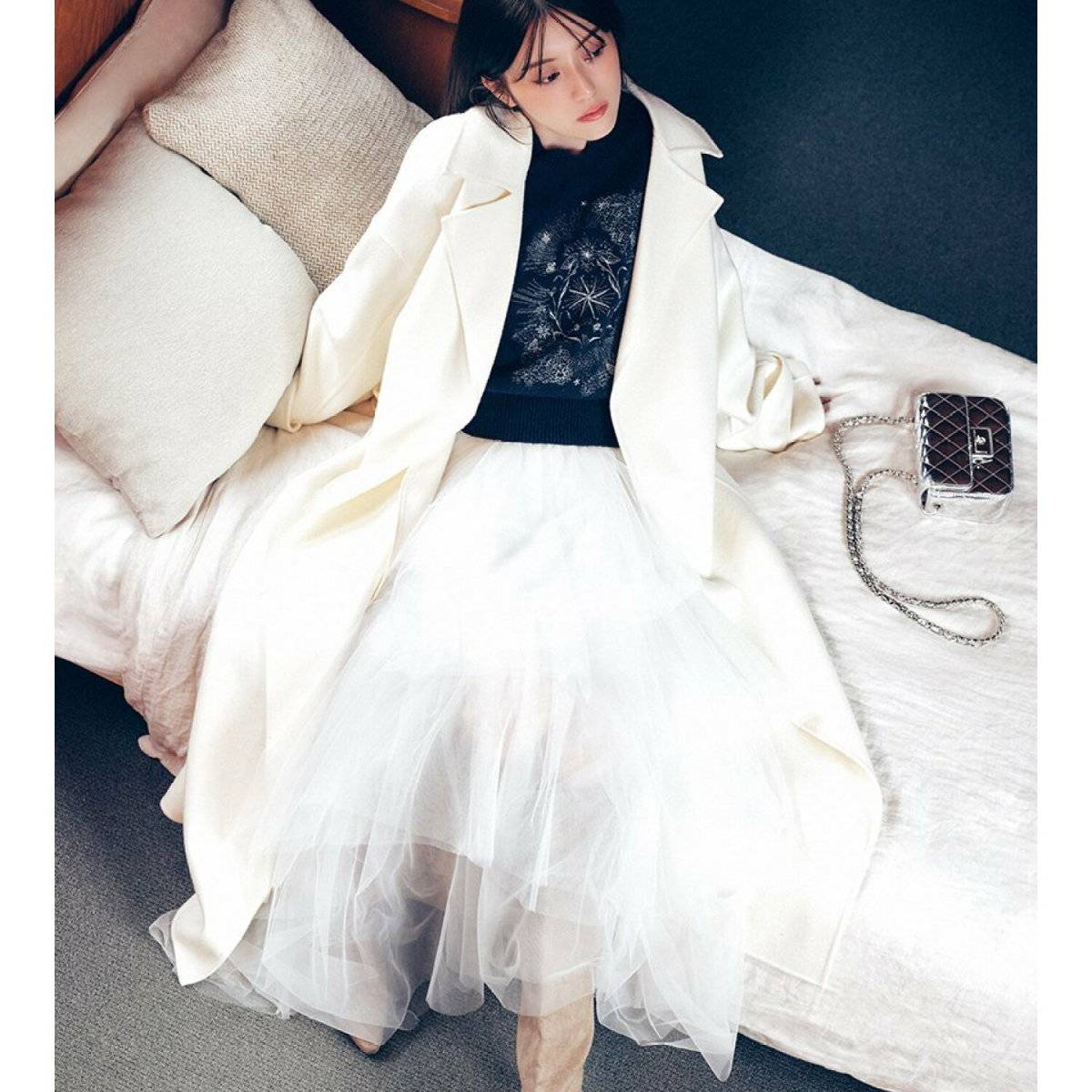 白のコートが映えるよう、トップスや小物には黒を、チュールスカートにはホワイトを選ぶと良いですよ♡