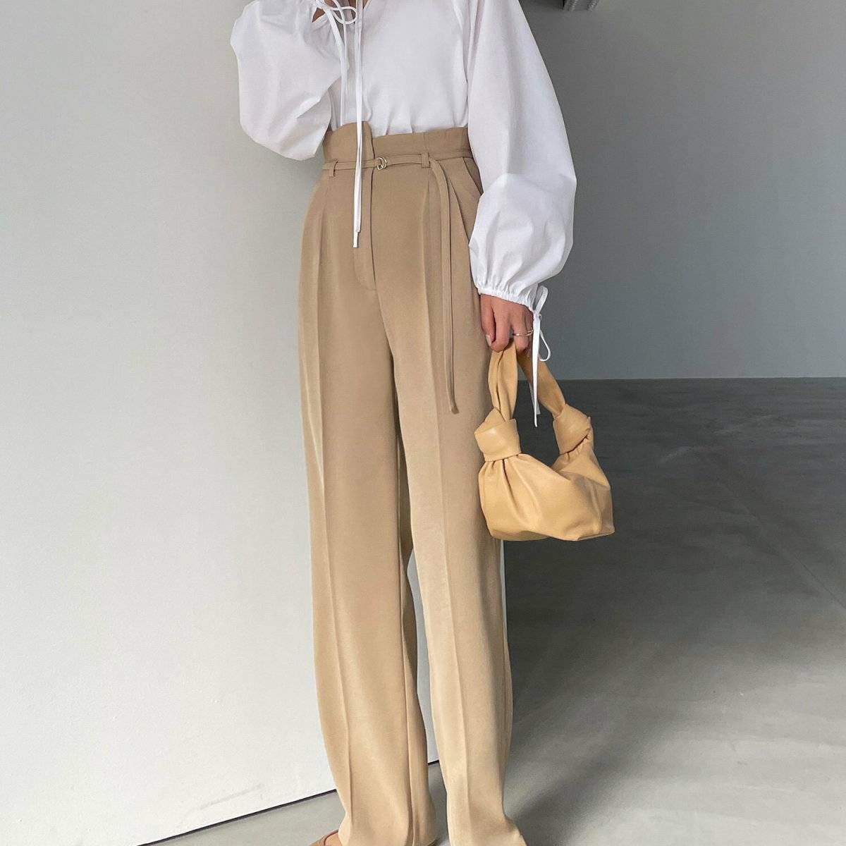 パンツコーデをスタイルアップして見せたいのであれば、ハイウエストパンツを選ぶのではなく、トップスの上からベルトを巻くなど、別の方法でウエストマークをすると良いですよ。