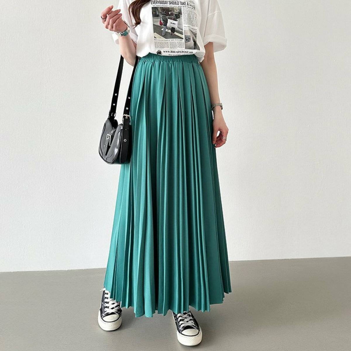 女性らしいプリーツカートの足元にあえてスニーカーを合わせたファッションは、まさにはずしコーデ!