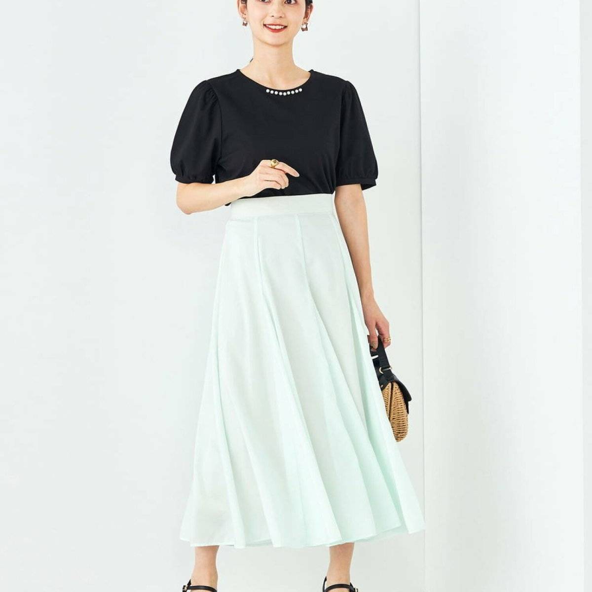 トレンドカラーのグリーンのスカートは、ほんのり透け感を楽しめる素材感が◎
