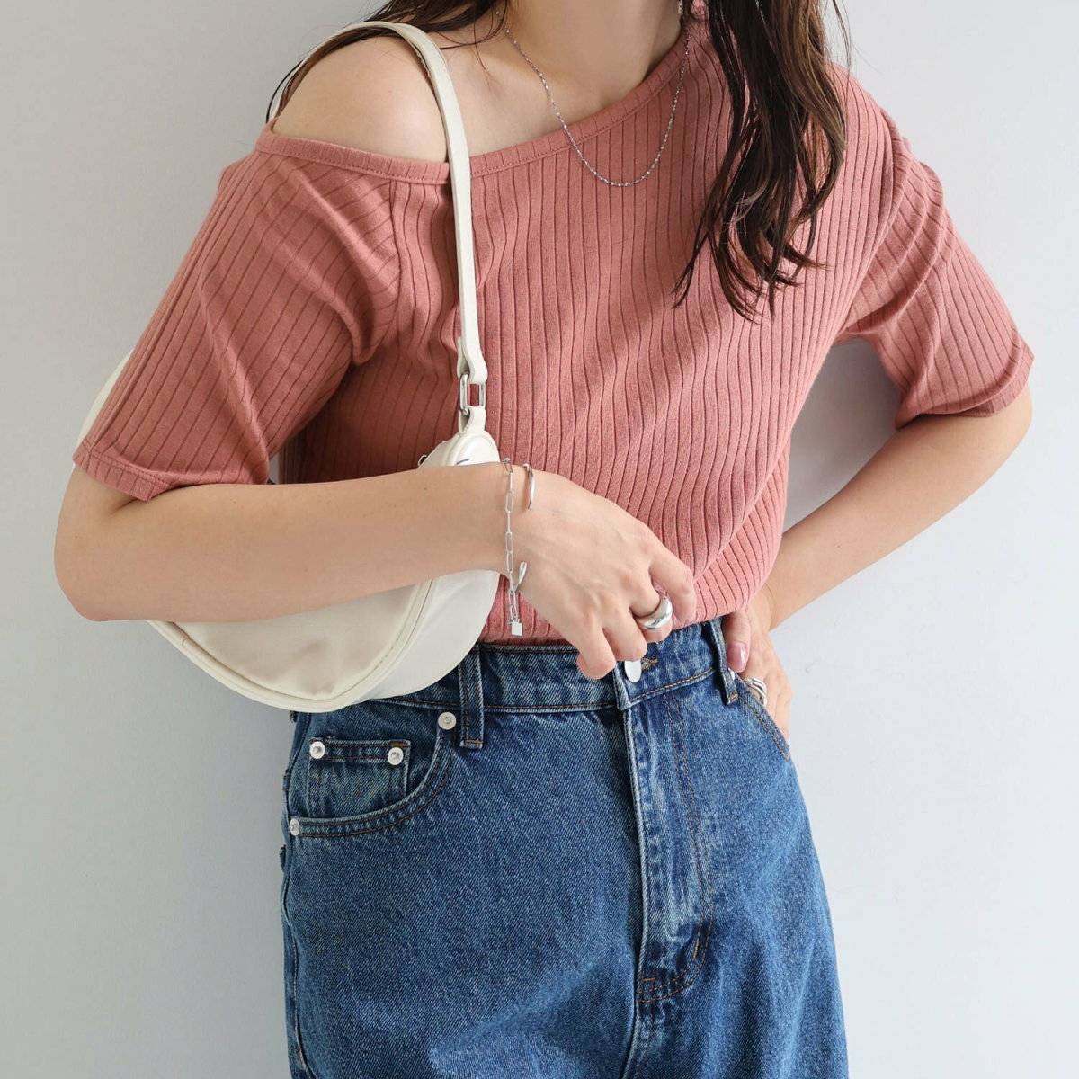 ということは……同様に、デコルテが広く開いた細身のリブTシャツもスレンダー体型さんにとってはNGアイテムです。