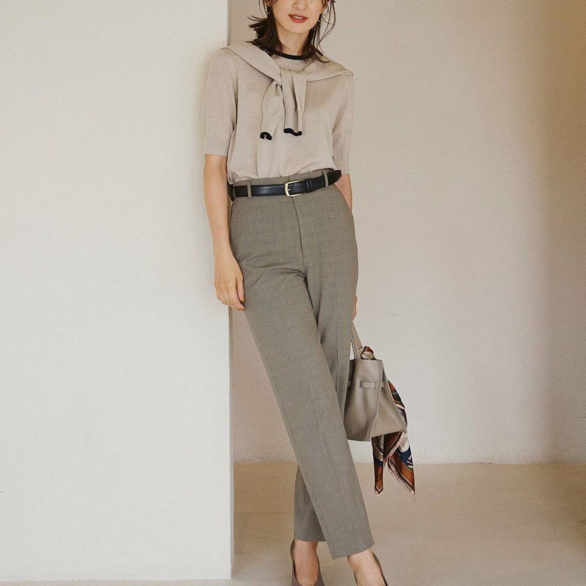胸が大きい人にNGな梅雨のパンツコーデ⑤ベージュ×コンパクトサイズのトップス
