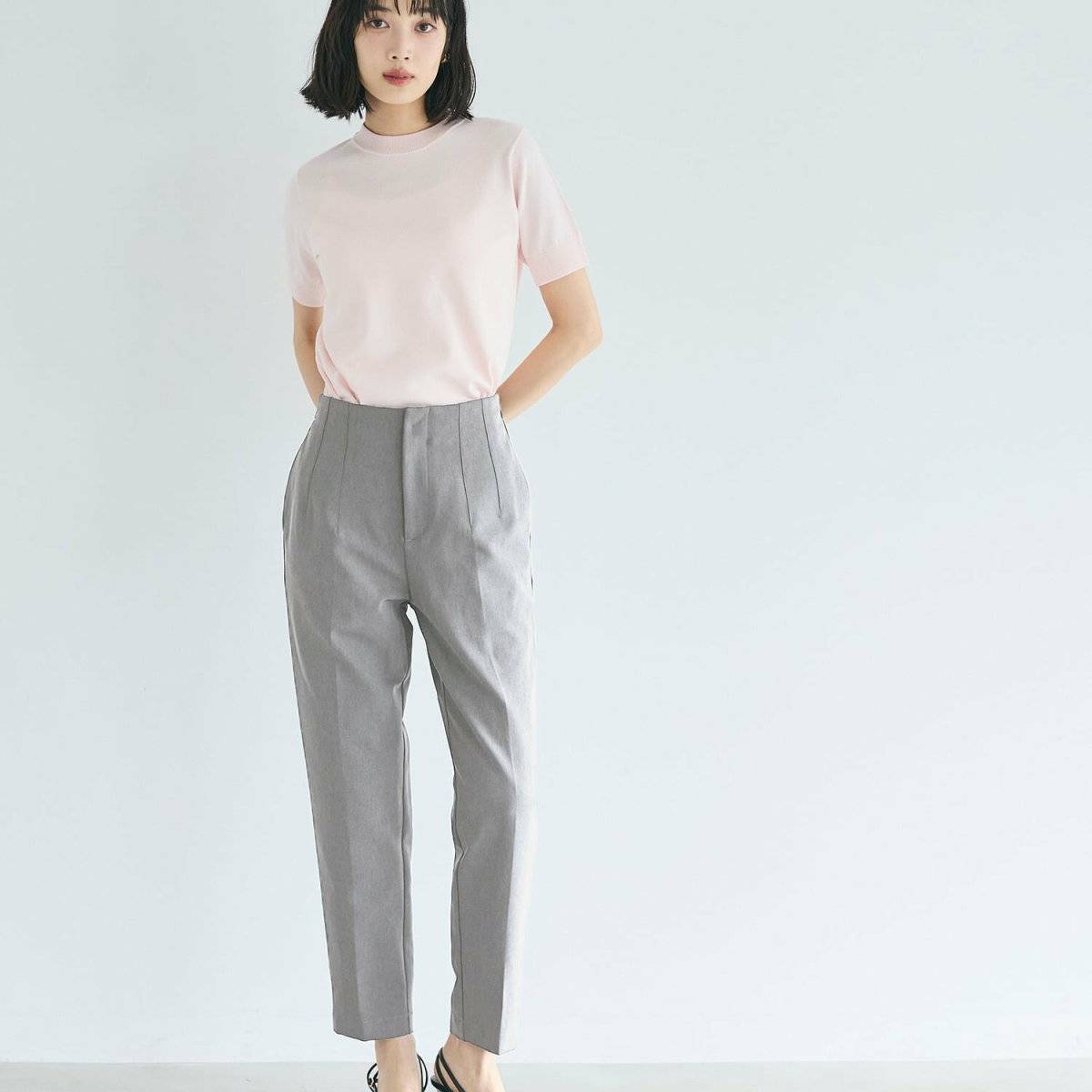 脚長効果が期待できるトップスイン×ハイウエストパンツのコーデですが、洋梨体型さんにはNG。