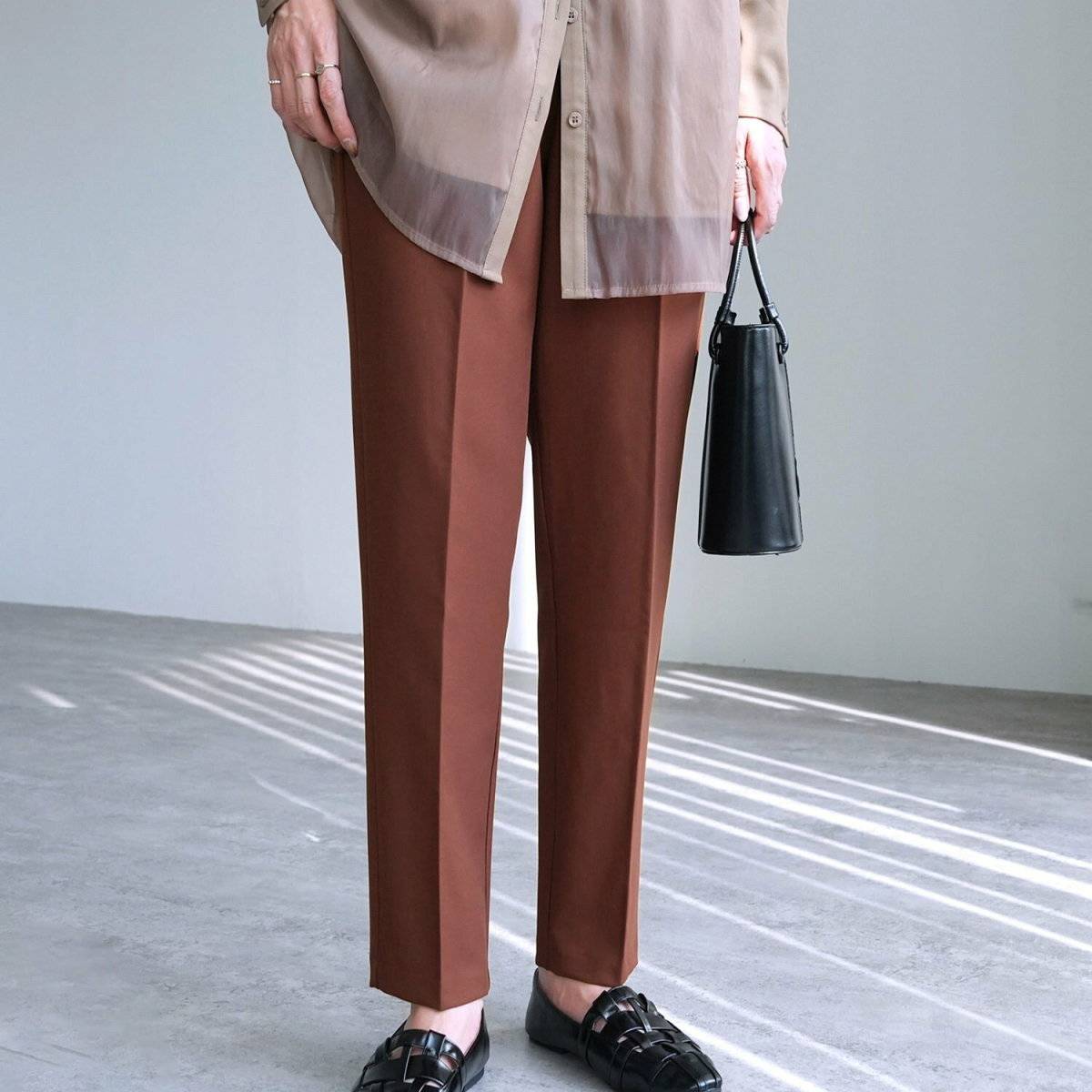 おしりを隠すことができるロング丈のブラウスがあれば、初秋のパンツコーデも怖いものなし♪