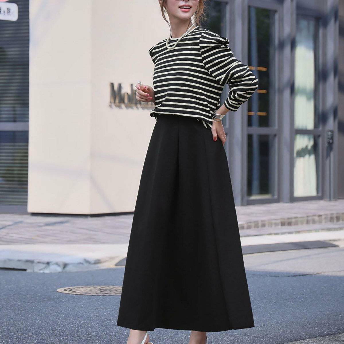 スカートはミディ丈を選んで足首を見せると、ブラックでも重たく見えず、春らしいコーデに仕上がります。