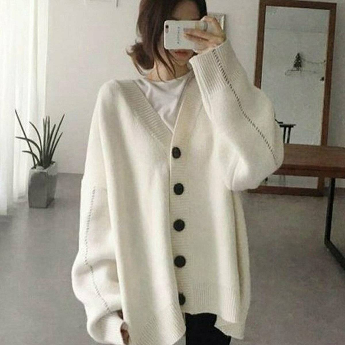 オーバーサイズのカーディガンを羽織ると、おしゃれに見えて体温調整ができるのが◎