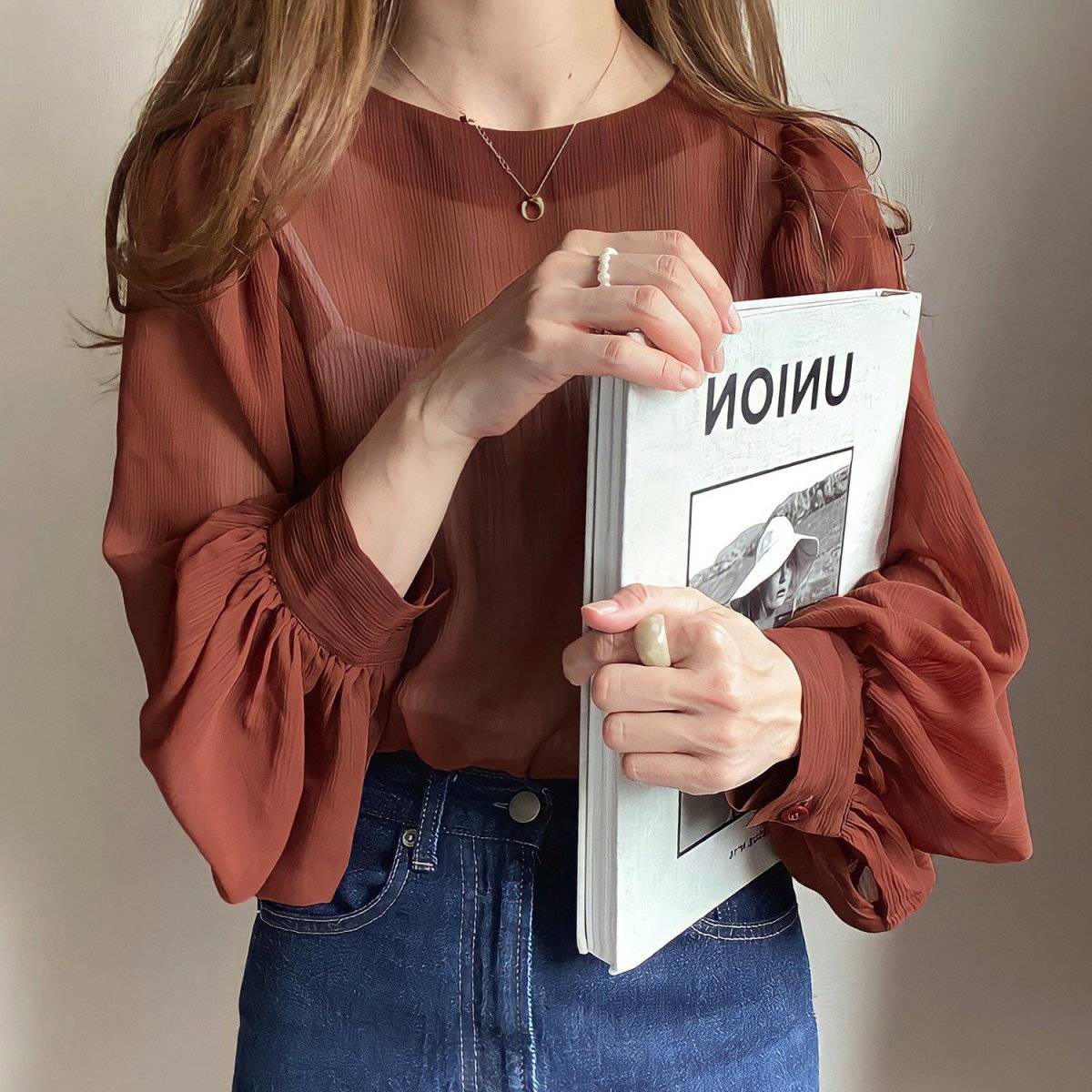 テラコッタ色のシアーブラウスには、ラフなコーデに仕上げるべく、デニムを合わせると◎