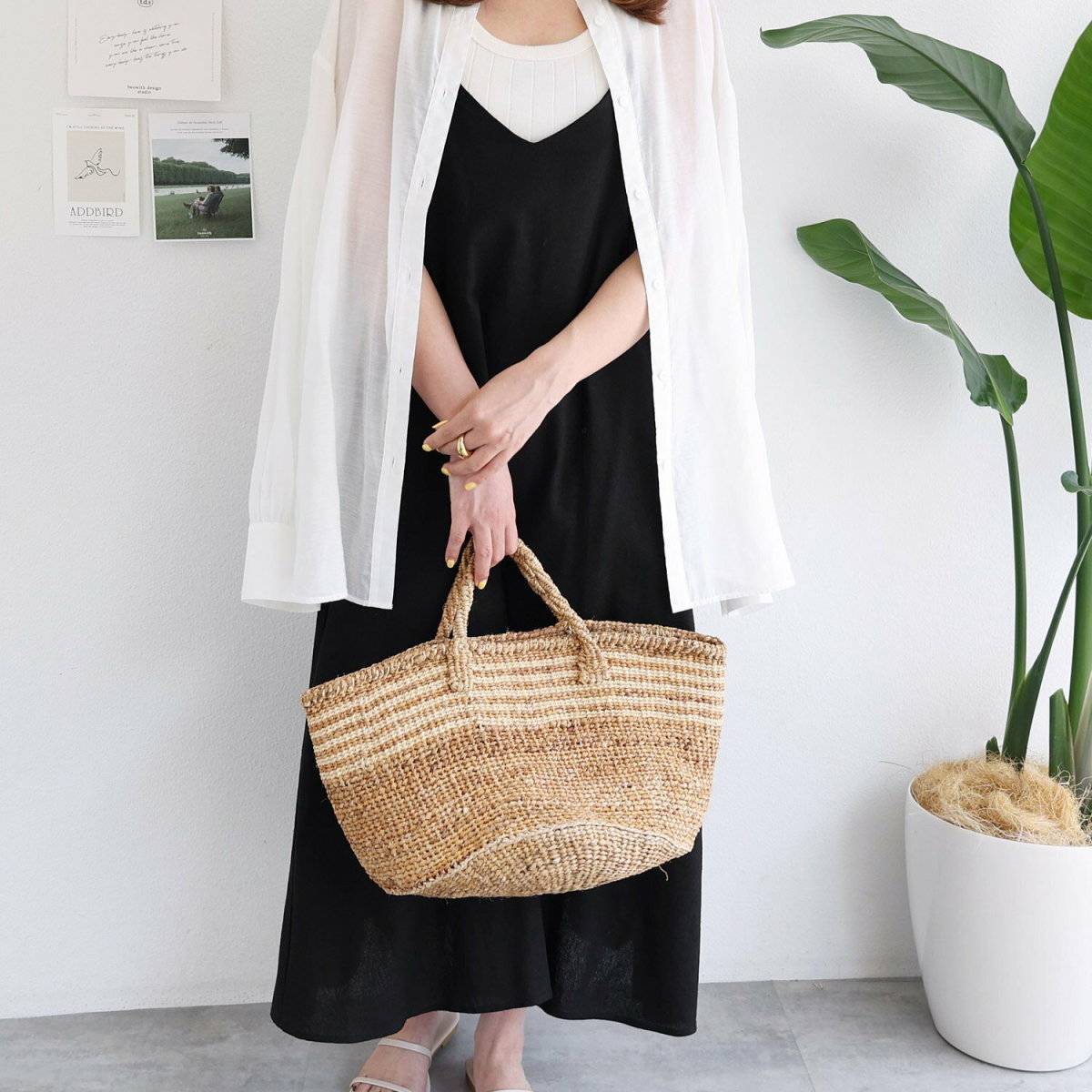 夏らしいシルエットのダークカラーワンピースは、ロング丈なのでただ着るだけでは重たい印象に見えてしまうことも……。