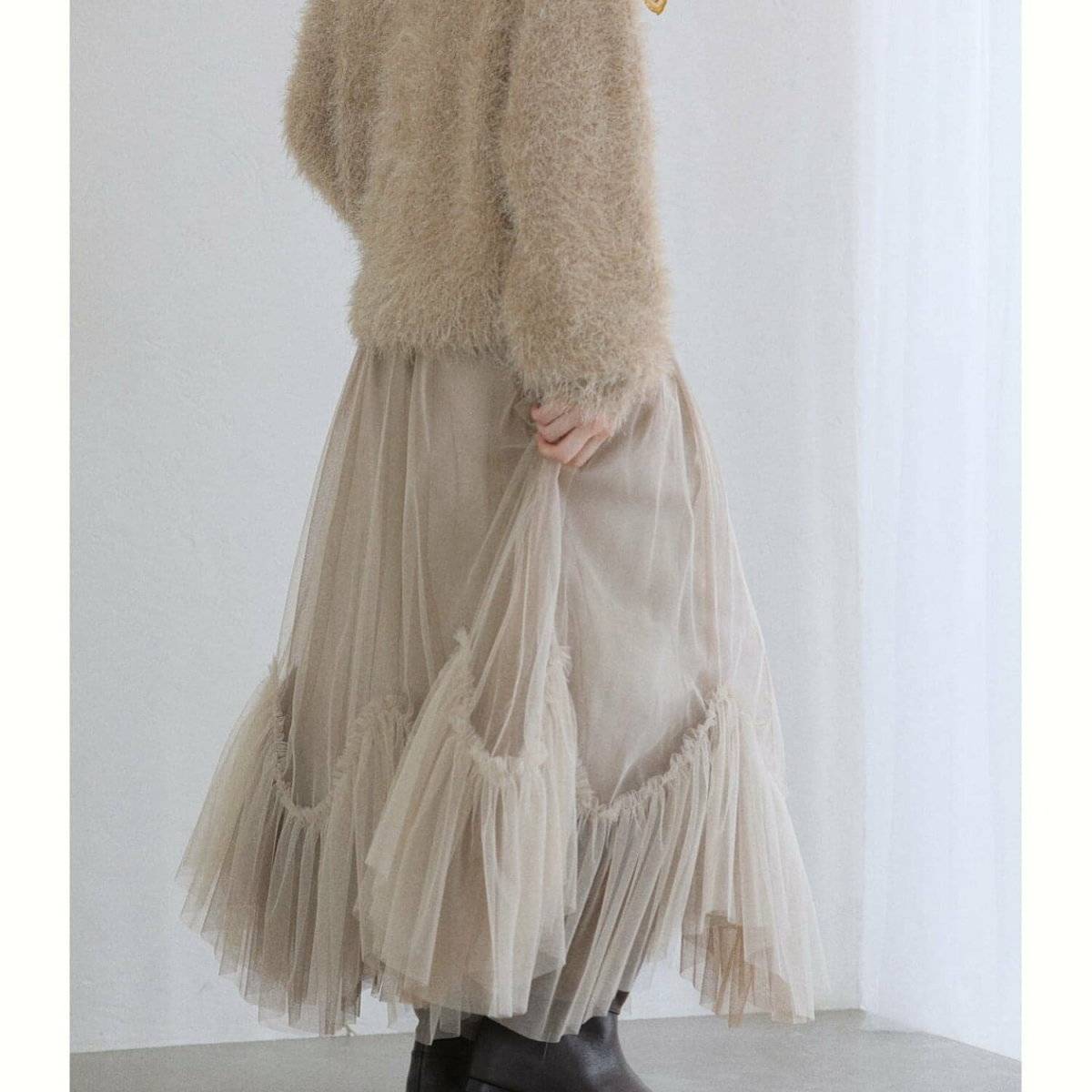 チュールデザインを選ぶと、ざっくりニットのボリュームに負けることなく、バランス良く着こなすことができますよ。