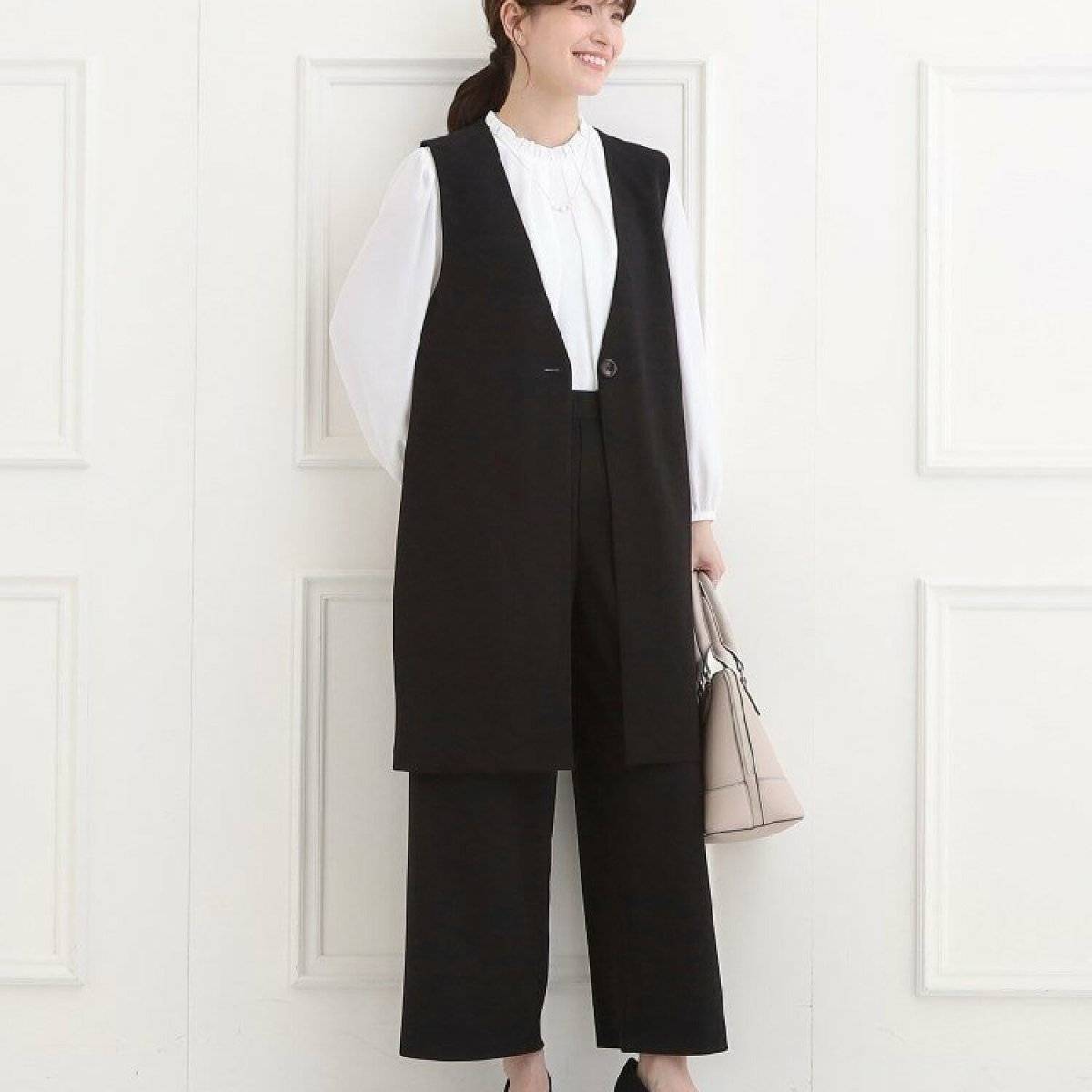 ブラックのロングジレを羽織って、Iラインシルエットを強調しているのが◎