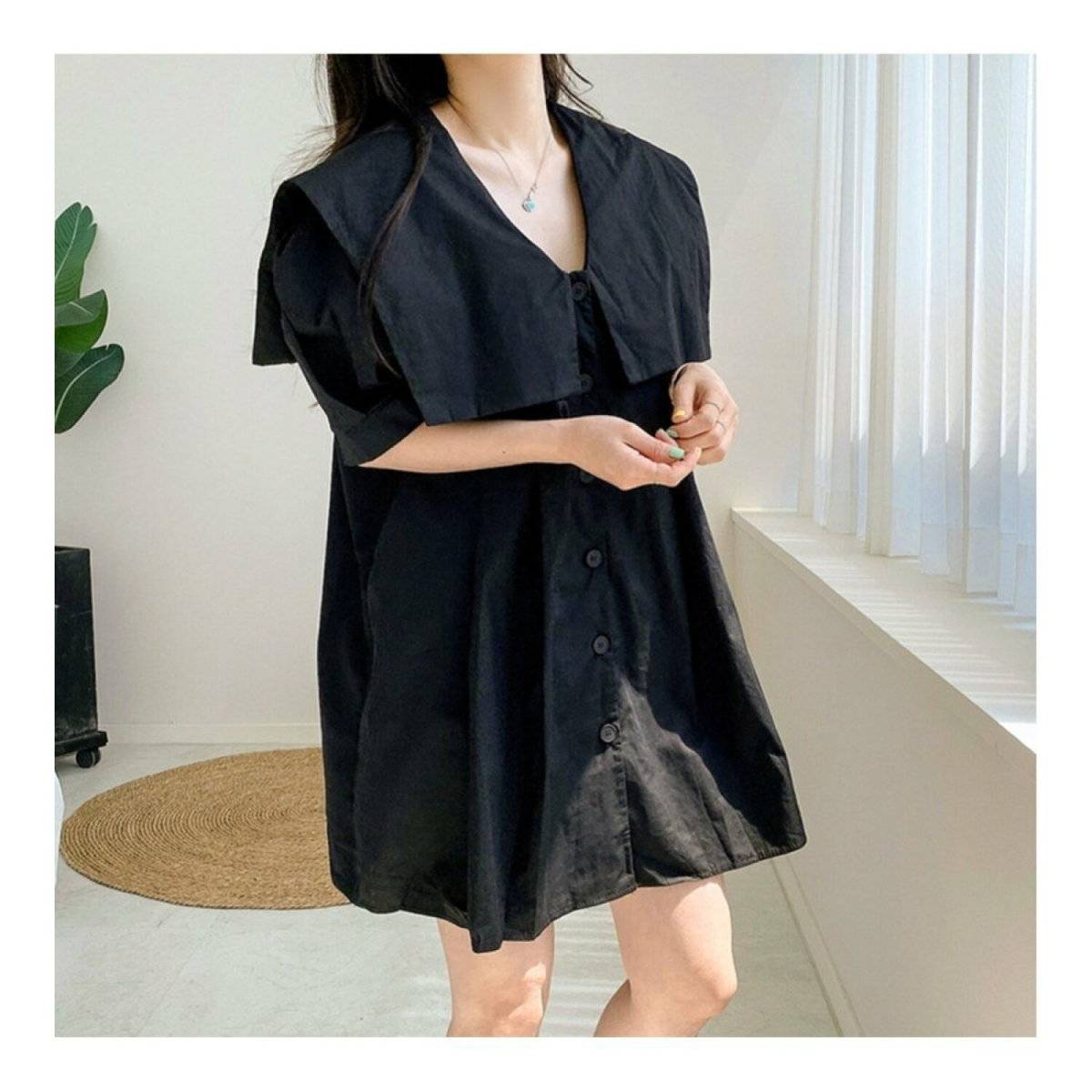 大きめのセーラーカラーが目を引くワンピースは、シャツデザインのものをチョイスして大人可愛く着こなしましょう。