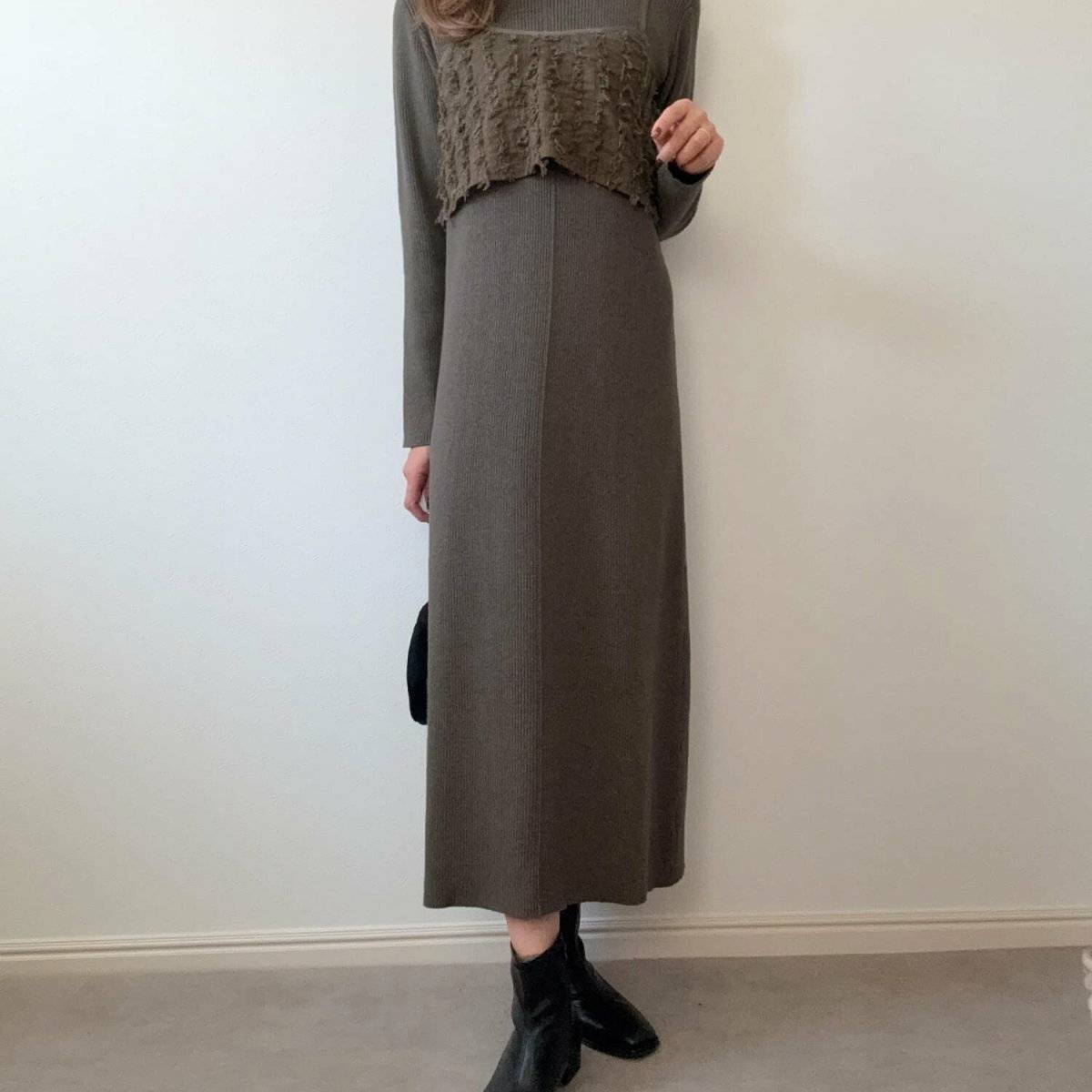 ③ストレートデザインのロングワンピース×ニットビスチェ