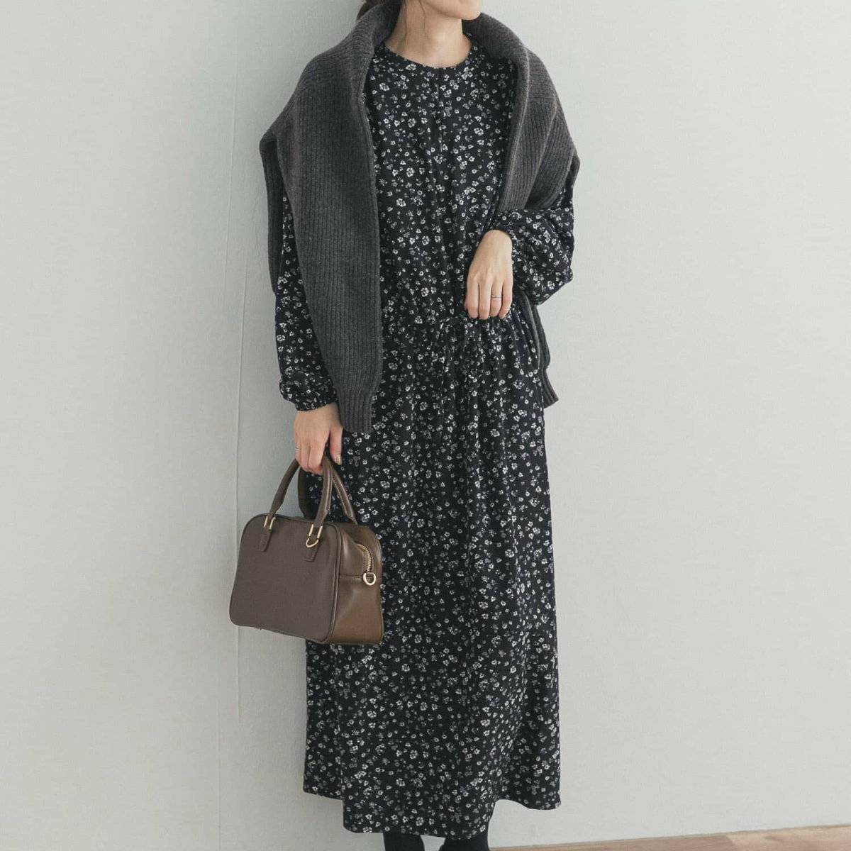 濃色のワンピースは、小さめの柄を選べば可愛らしすぎず、顔タイプクールさんでも着こなしやすいですよ♡