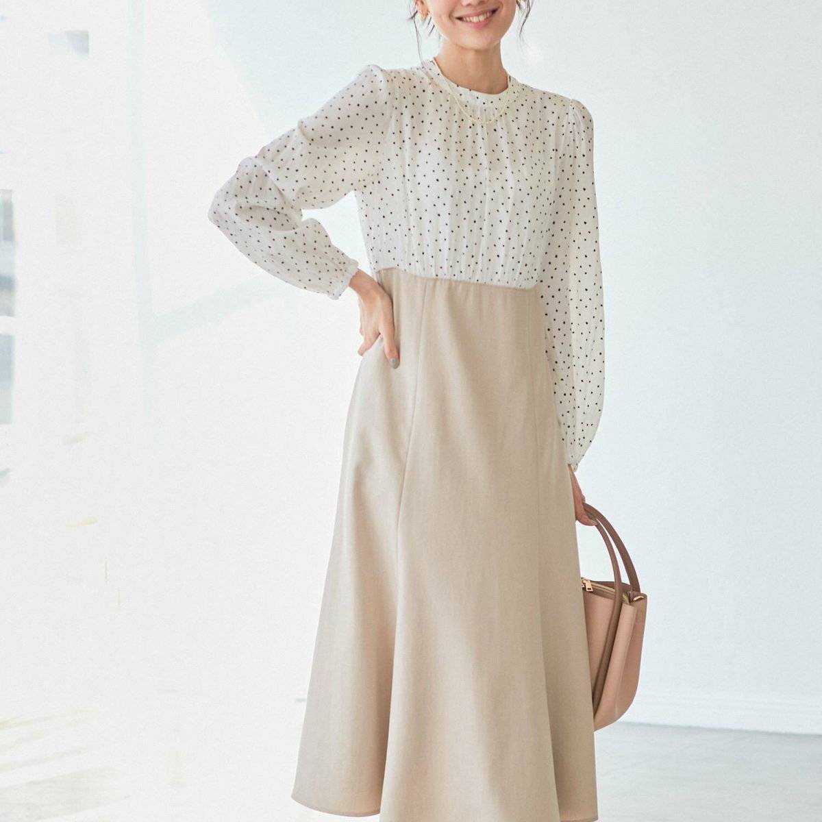 ウエスト切り替えでスカート部分にボリュームのあるデザインのワンピは、骨格ウェーブさんにおすすめです。