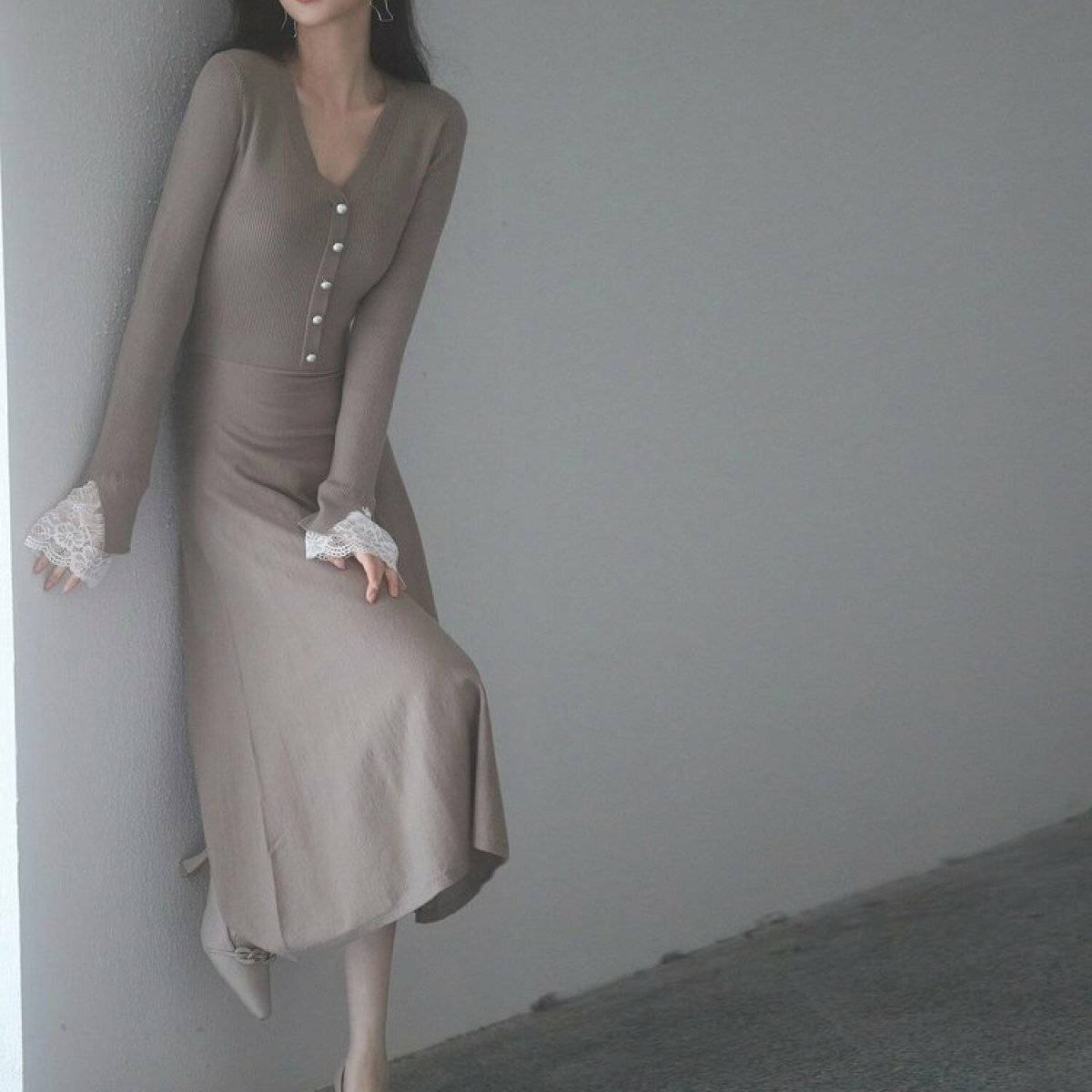 そこでおすすめしたいのが、Vネックでフロントボタン、そして切り替えデザインのニットワンピースを使った秋コーデです♡