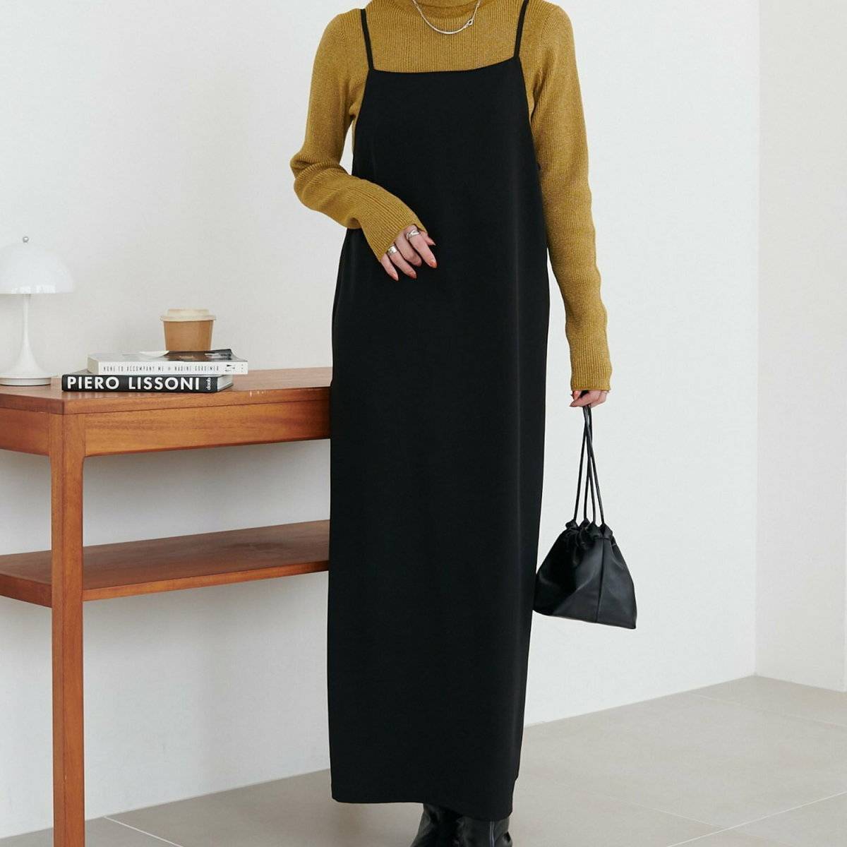 シンプルな黒のキャミワンピースとレイヤードして、おしゃれなコーデを楽しんで!
