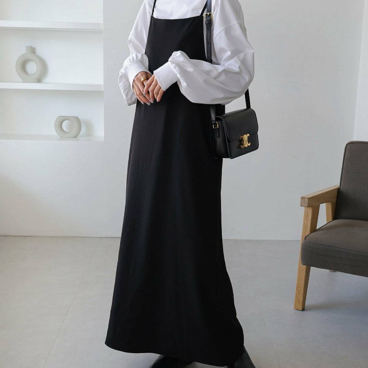 前結びデザインや足元や手首の肌見せなど、適度にメリハリを意識することで、重すぎず抜け感のあるオールブラックコーデに仕上がります♪