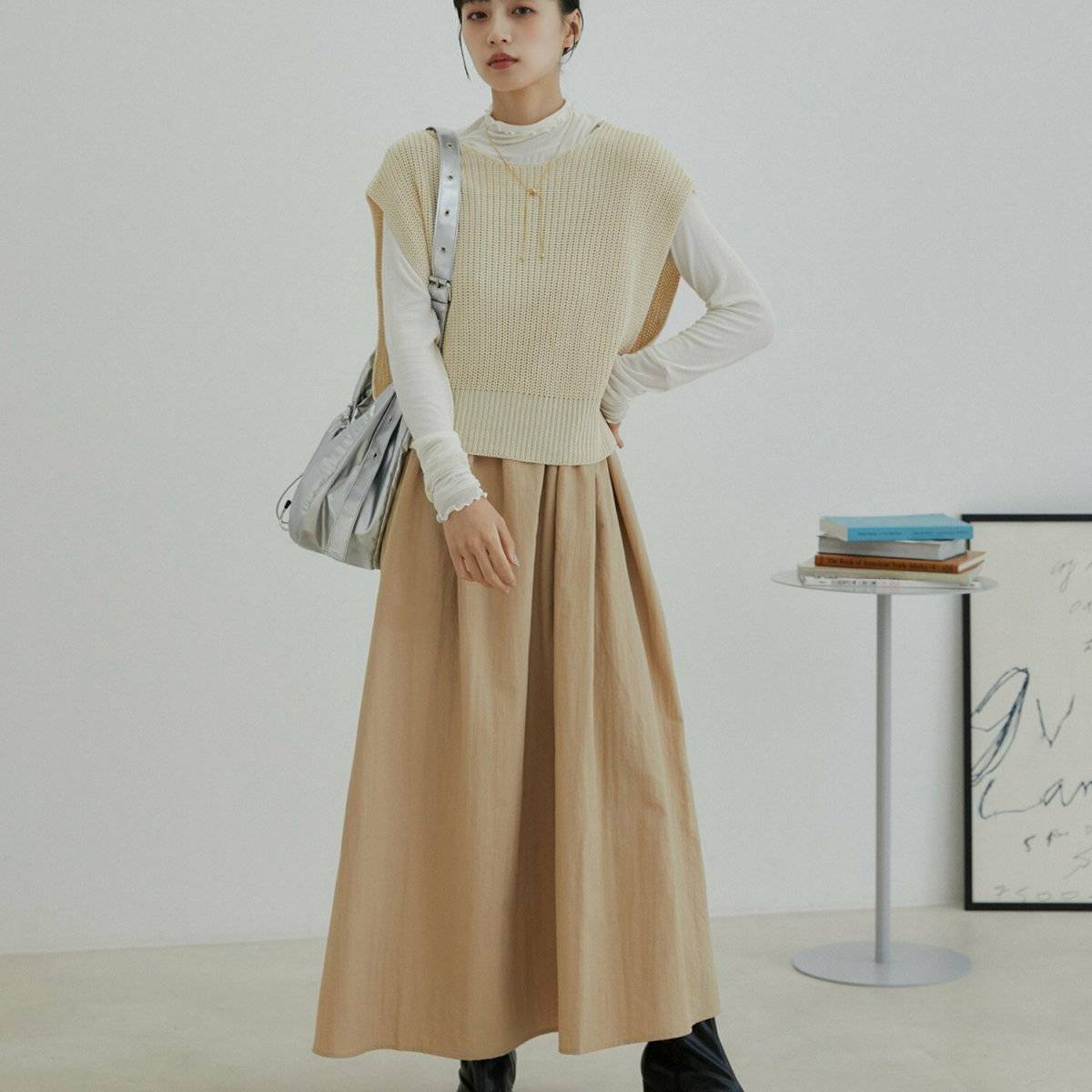 ニットベストをレイヤードすると視線が上がるので、ゆったりワンピースを使ったコーデも着ぶくれしません♡