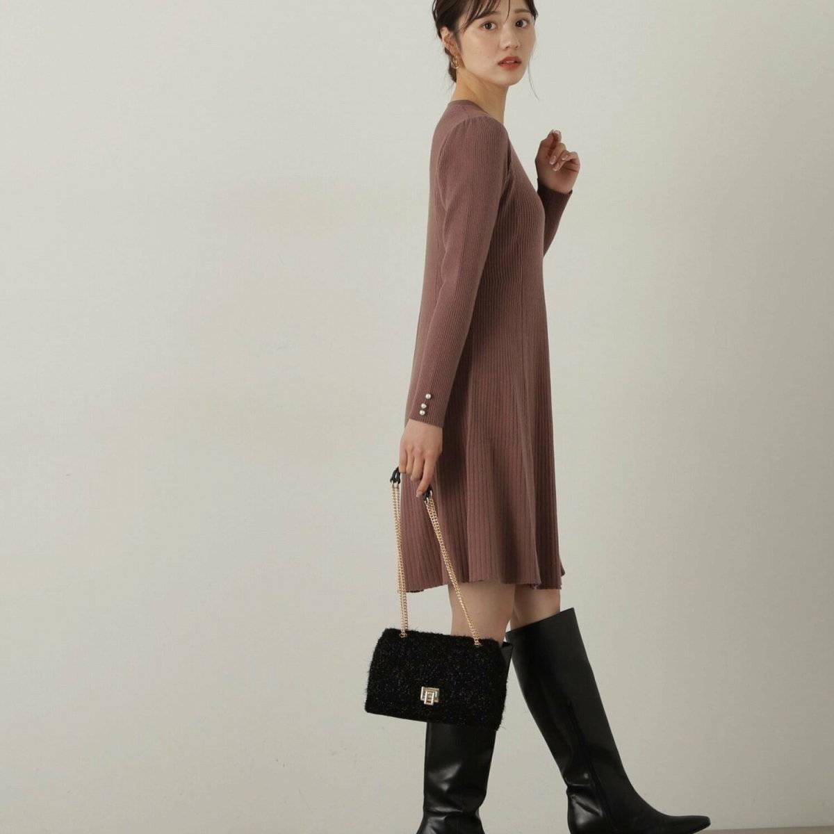 ミニワンピースにロングブーツを合わせる特別感のあるコーデは、ブラウンをメインにまとめると大人可愛く着こなせます。