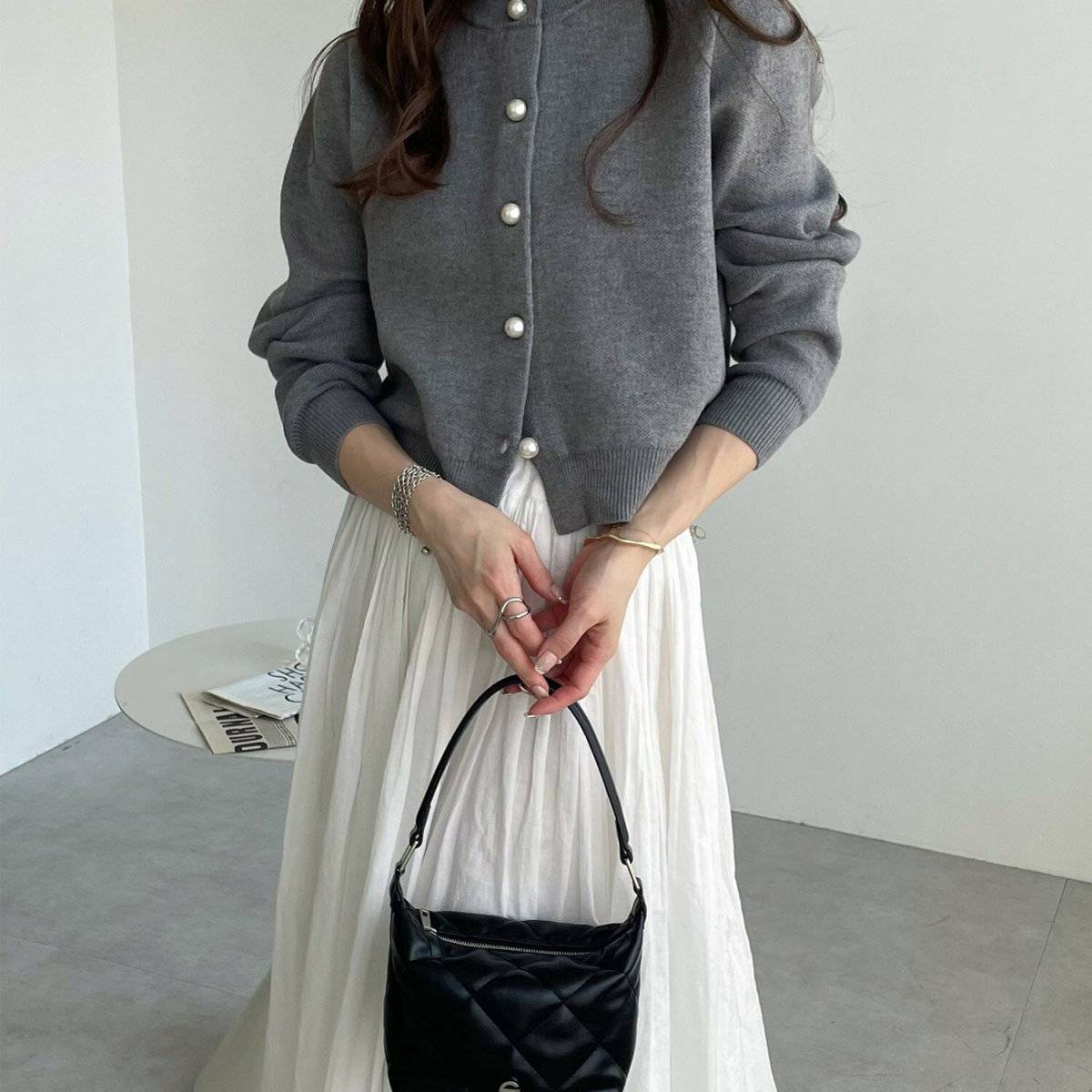 ⑤きれいめカラーのカーディガン×ホワイトスカート