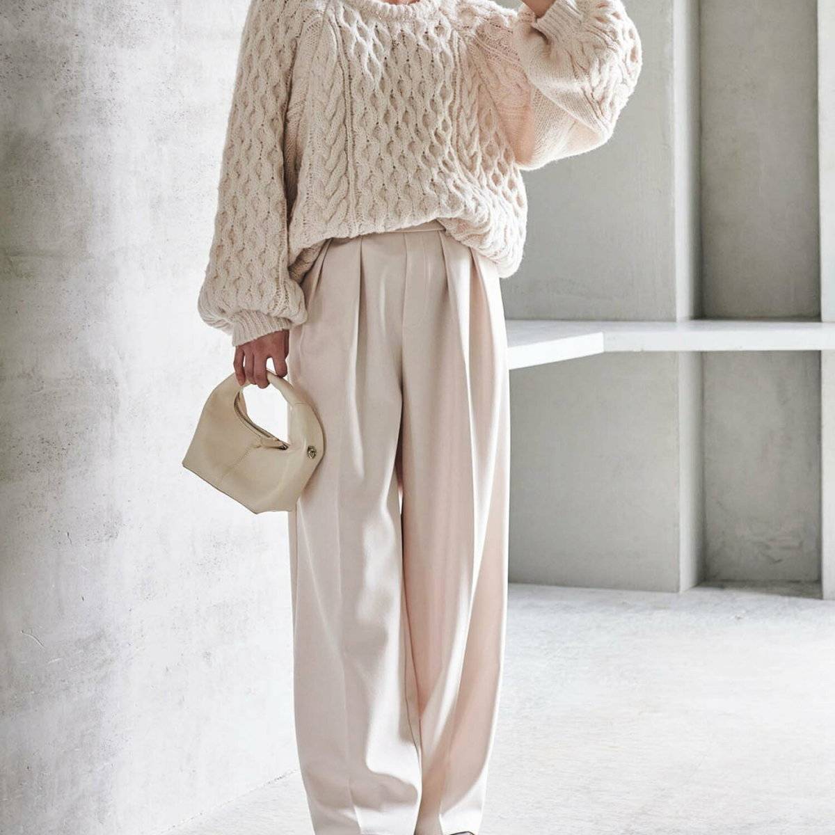 秋らしいざっくりニットトップスに合わせるのは、タックパンツが◎