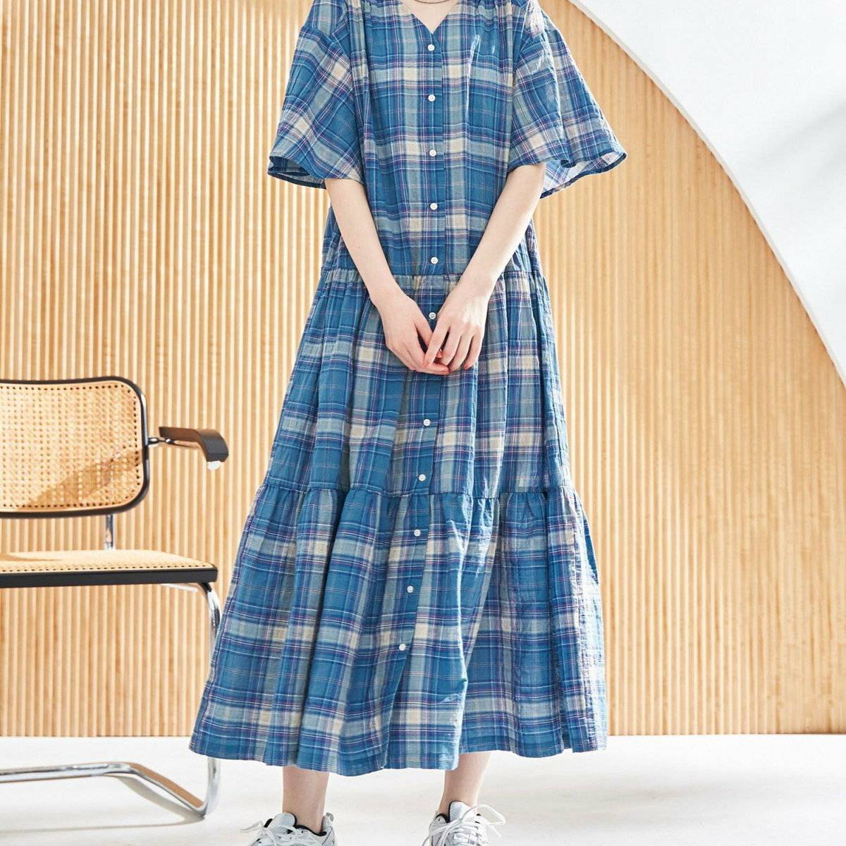 ブルーのVネックワンピースなら、Iラインシルエットを強調するので、ぽっちゃり見えせず、スッキリとした印象に♡