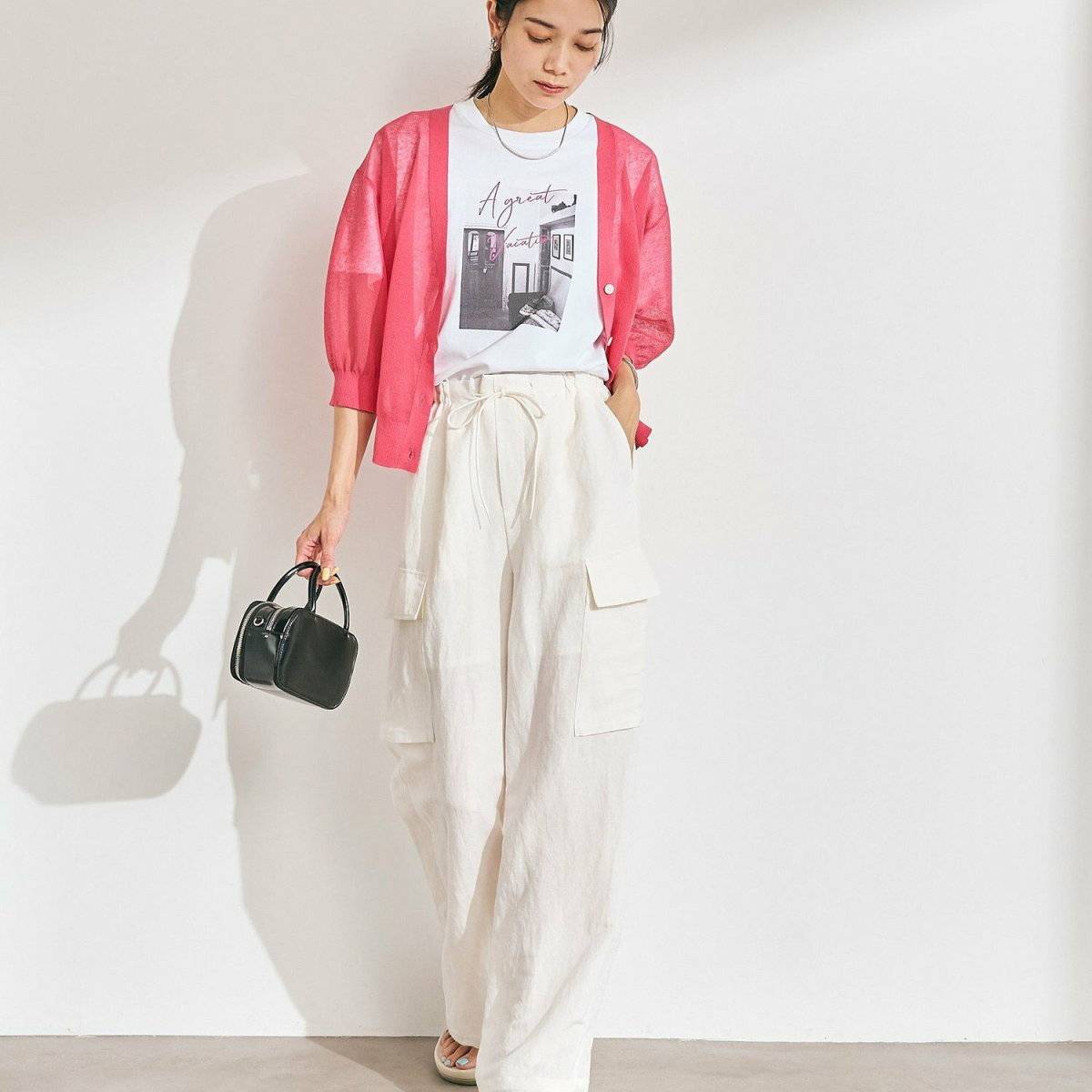 白のカーゴパンツを使った着こなしは、明るく涼しげな印象に見えますよ♡