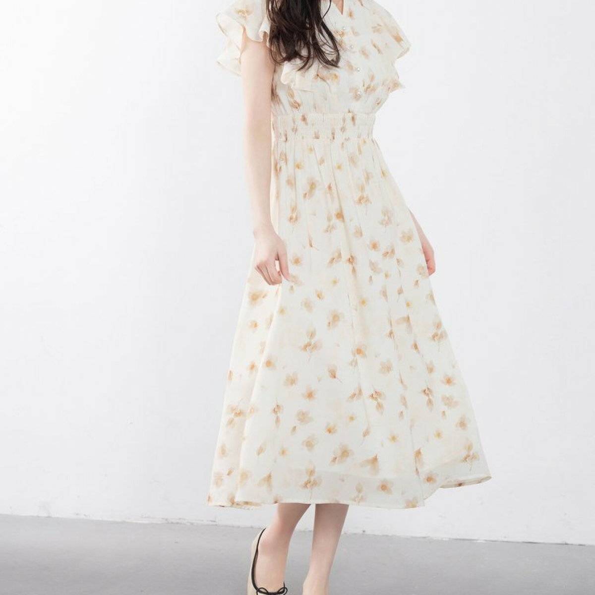 ⑤ベージュの花柄ワンピースで女性らしさを演出♡