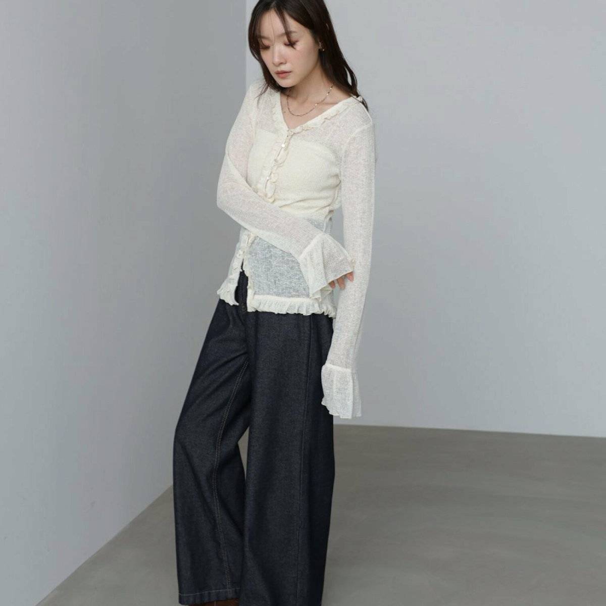 ⑤白カーディガン×黒デニム