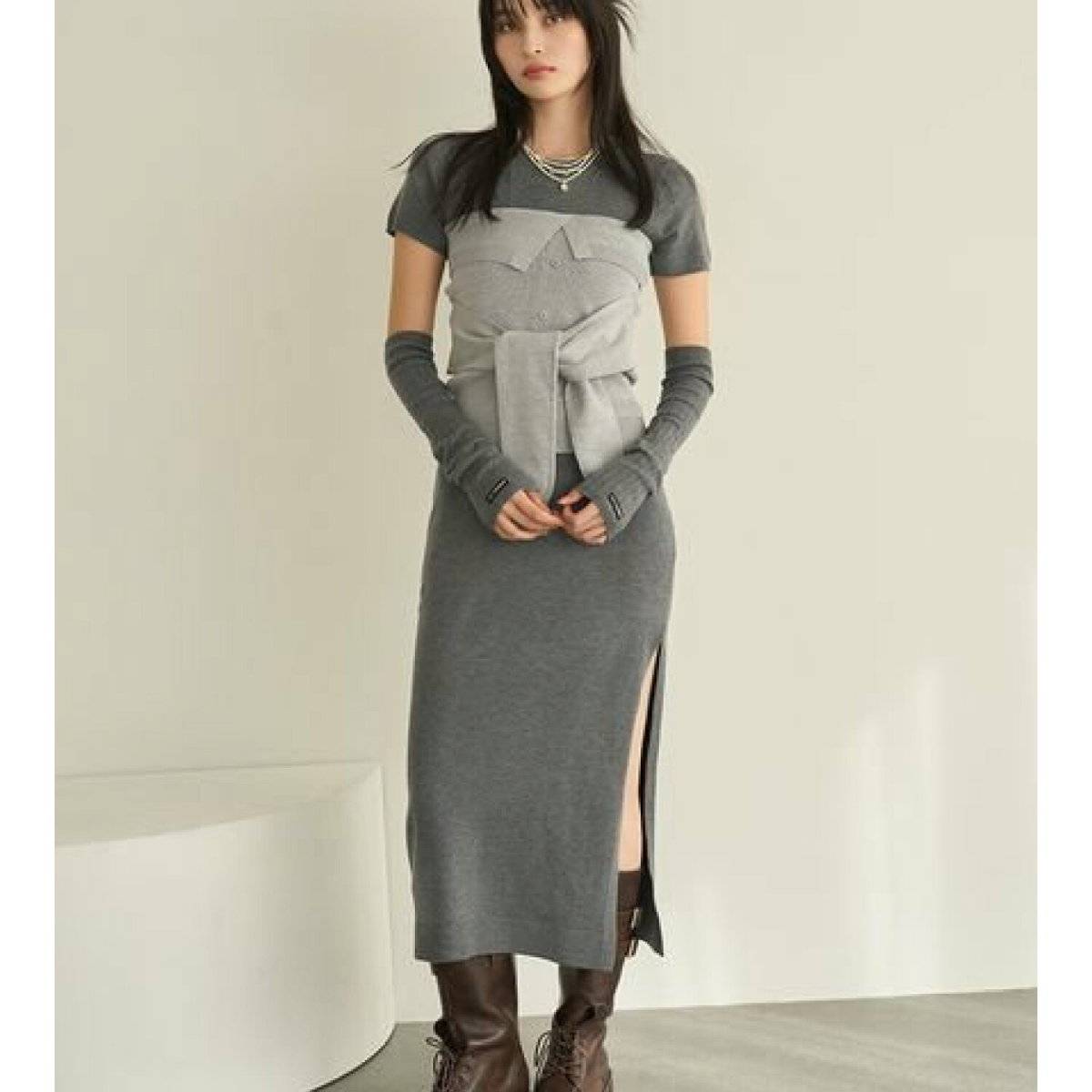 秋冬大活躍するニット素材の半袖ワンピースは、ビスチェを重ねてメリハリをつけるとおしゃれです。