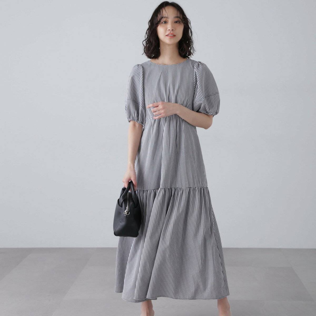 ⑤ギンガムチェック柄のワンピース×カラーバッグ