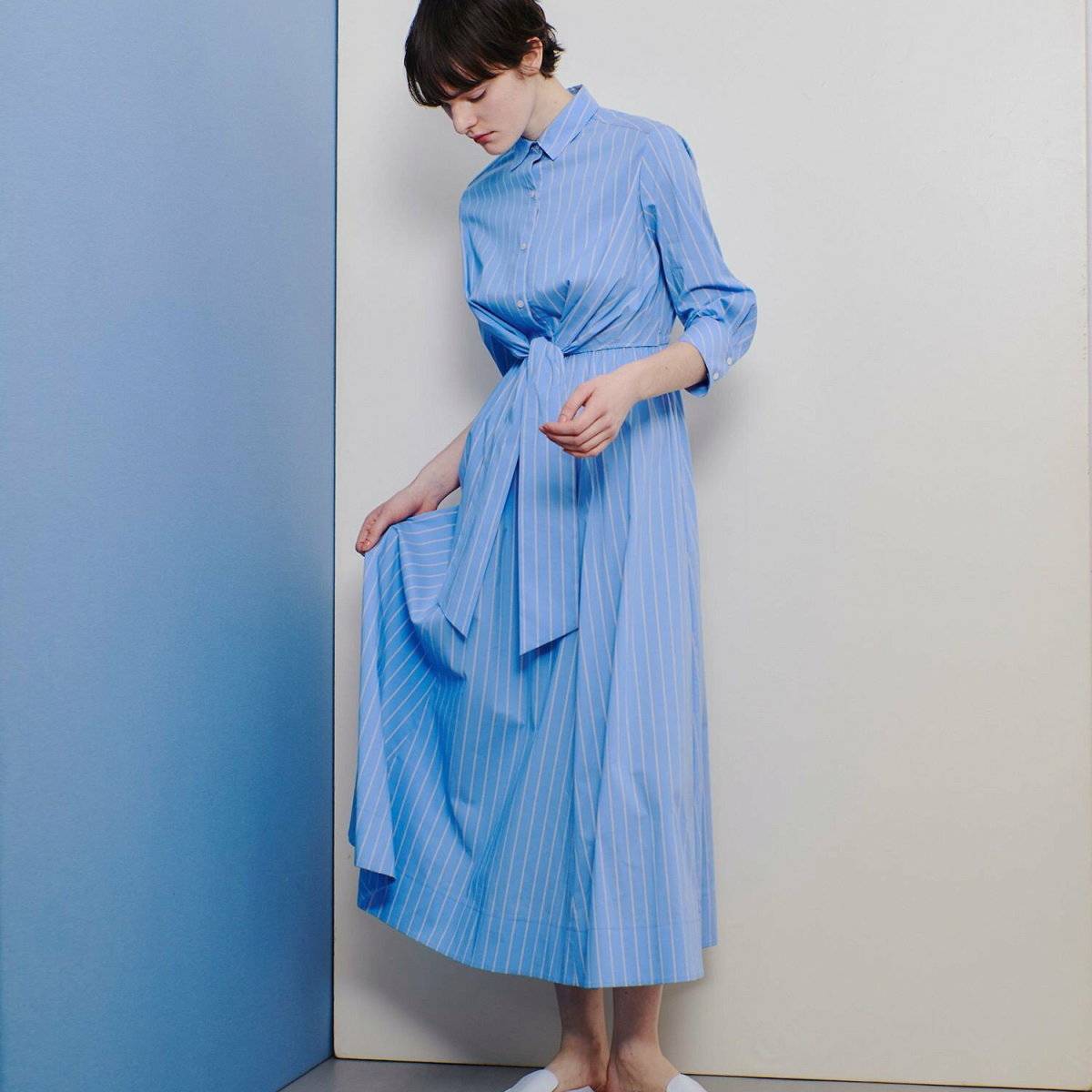 春らしいブルーのシャツワンピースは、きちんと感のあるシャツ襟とボリュームのあるスカートのバランスが華やかで、顔タイプエレガントの方によく似合うアイテムです♡
