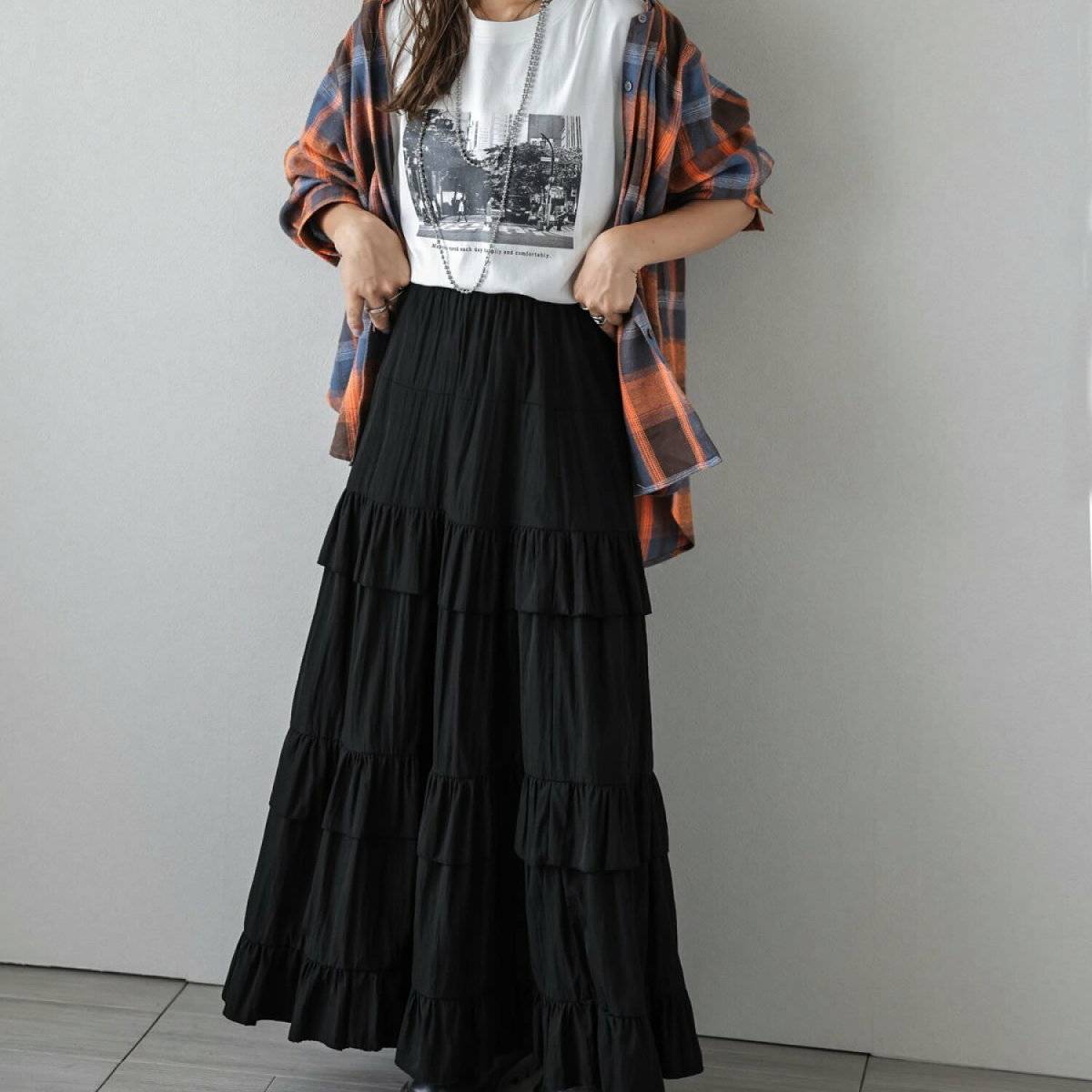 ボトムスに黒のロングスカートを合わせれば、おしゃれさも動きやすさも叶う服装に仕上がります♡