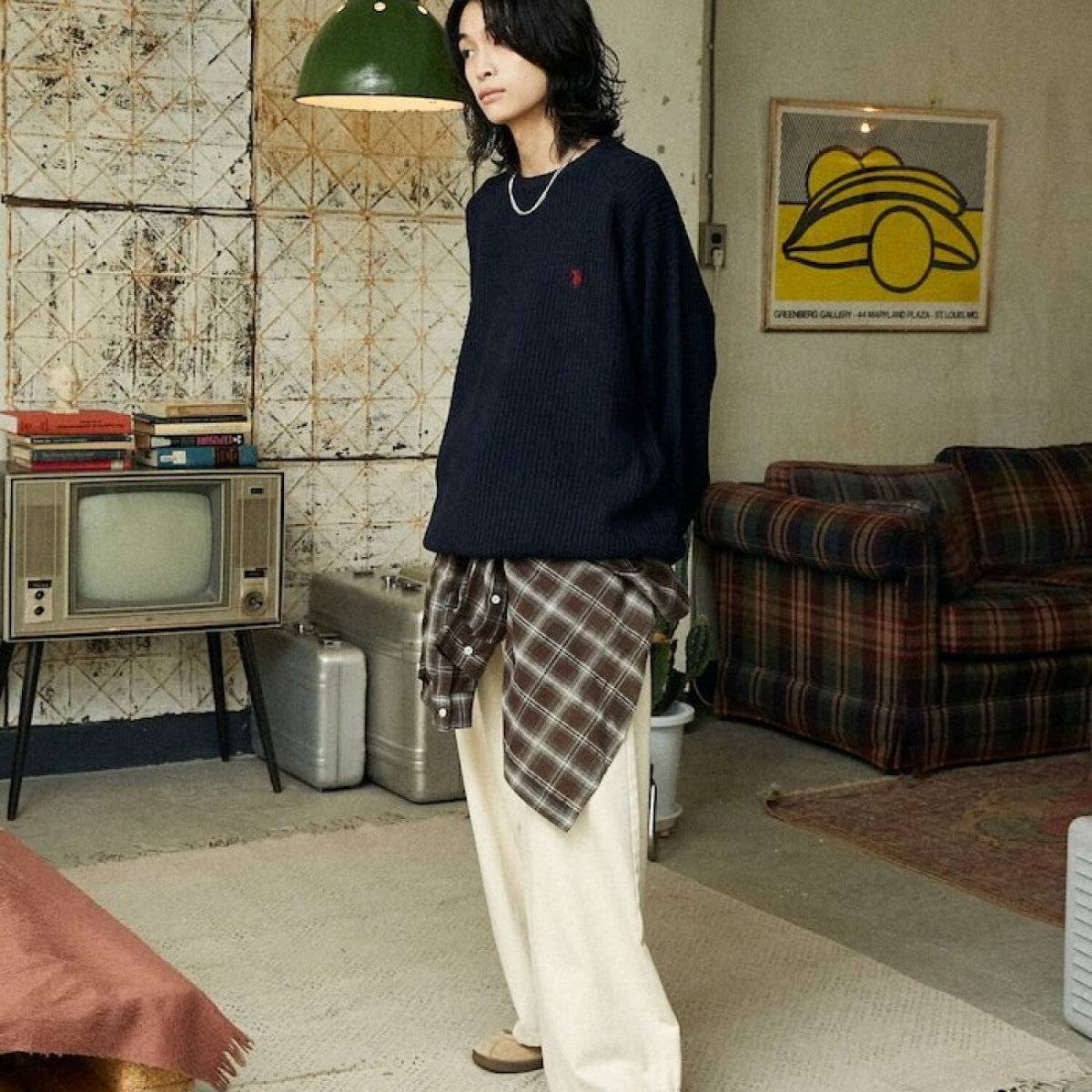 春の日差しが差し込む4月には、ニット×シャツのレイヤードがよく似合います。