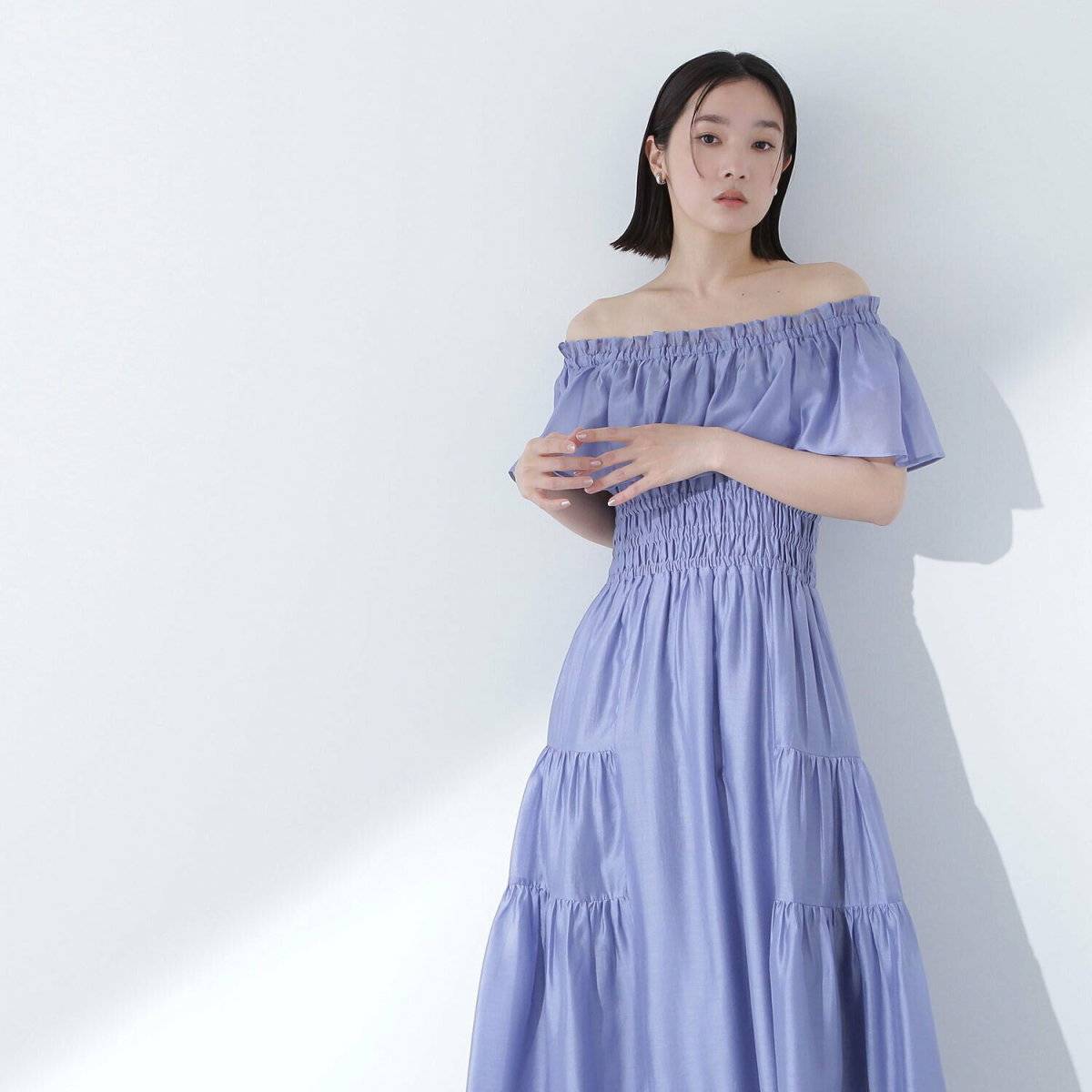 ふんわりシルエット&ボリュームスリーブのおかげで大人っぽく着こなせるブルーのオフショルワンピースは、服装の主役になるおしゃれアイテム♡