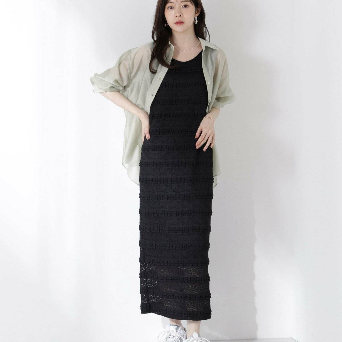 ④黒ワンピースにシアーシャツを羽織る♡