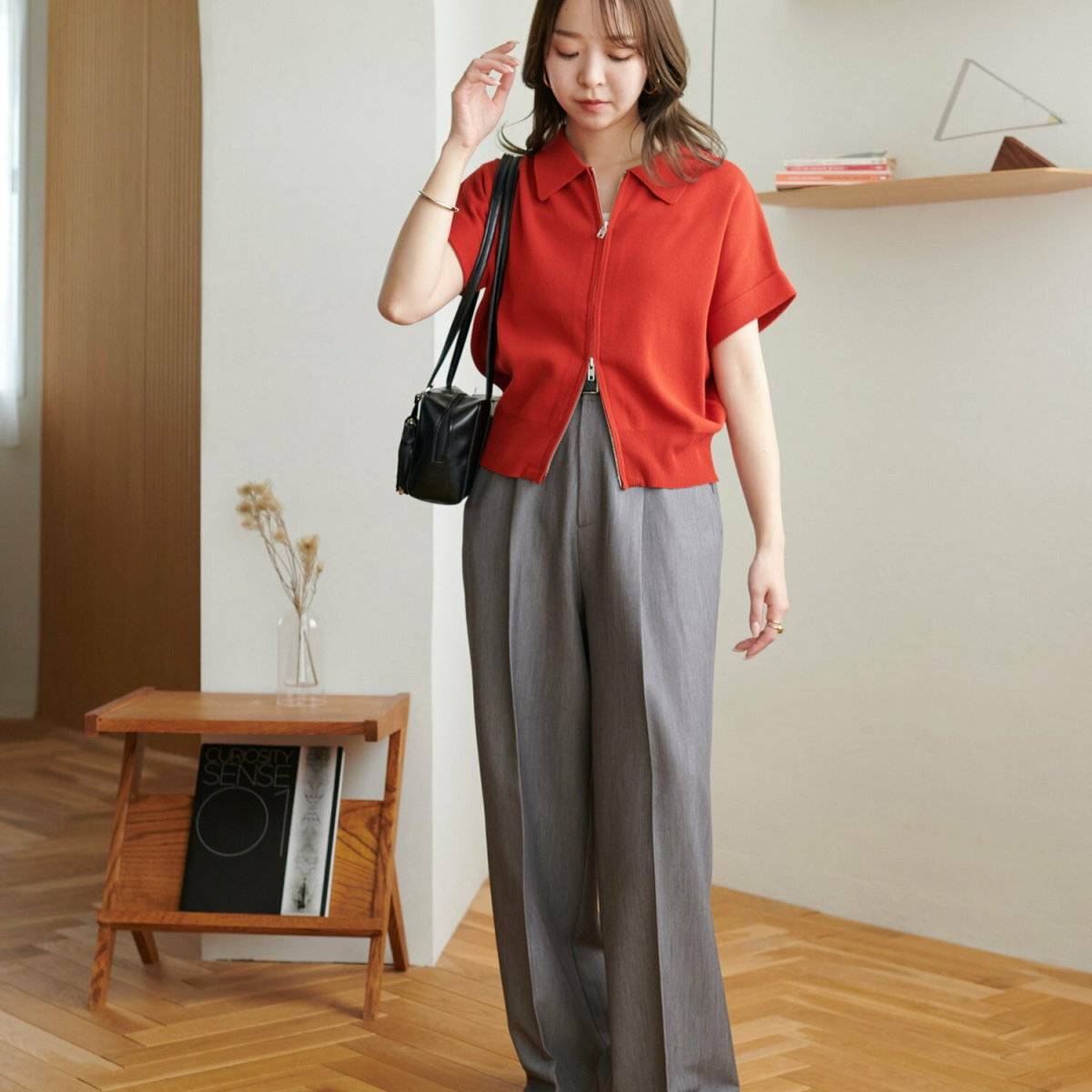 半袖の赤のジップアップカーディガンは、6月下旬の気候によく合ううえに、顔映りがよく華やかな印象に♪