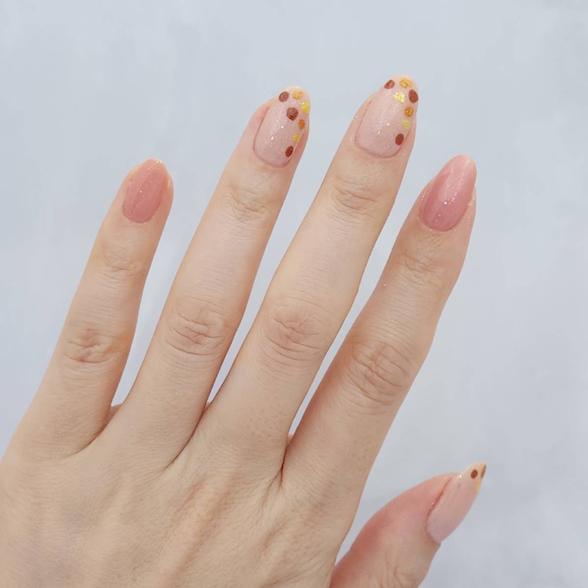 3色がランダムになるように、パールベージュのマニキュアの上に貼ってくださいね。