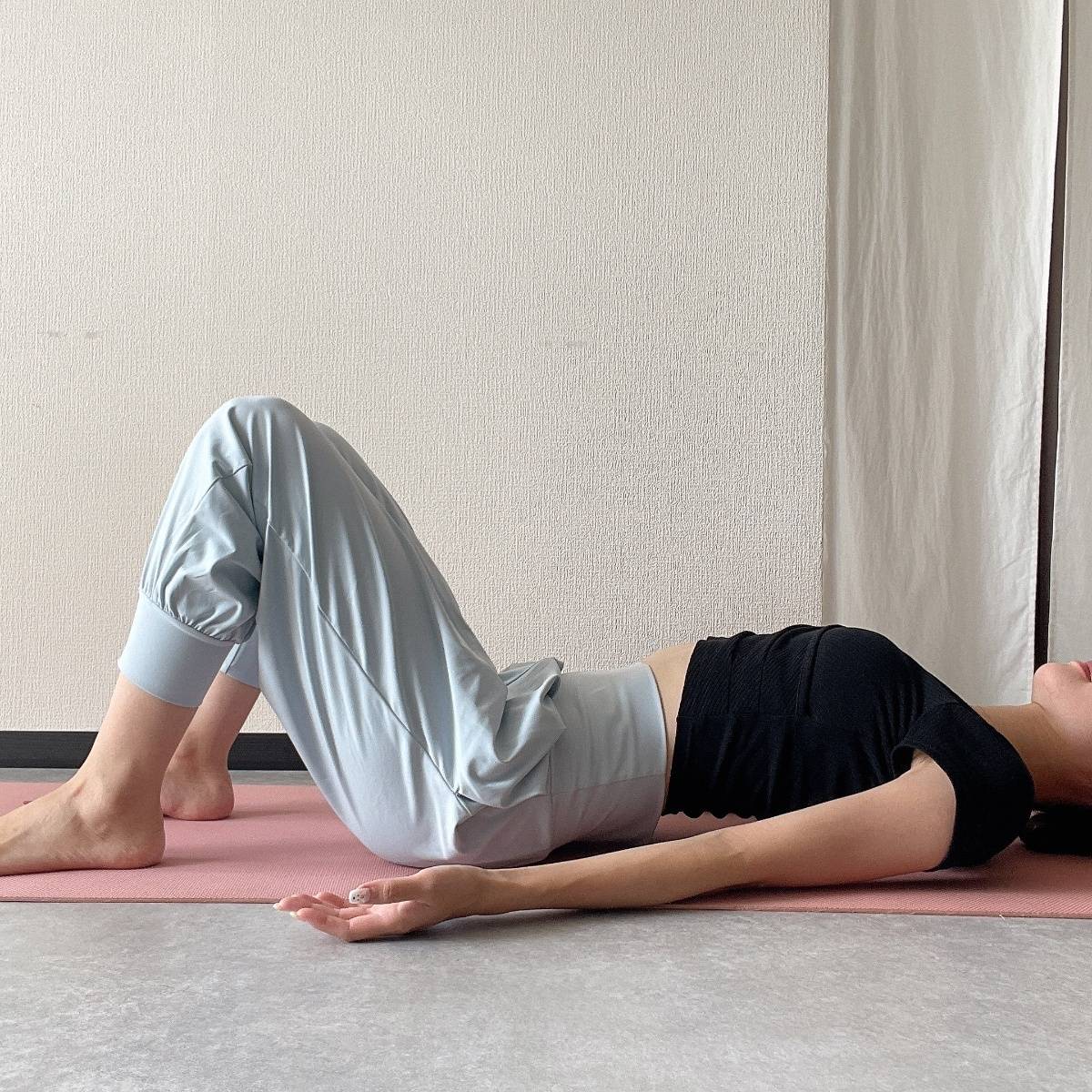 ペットボトルを体のそばに置き、マットの上で仰向けになります。