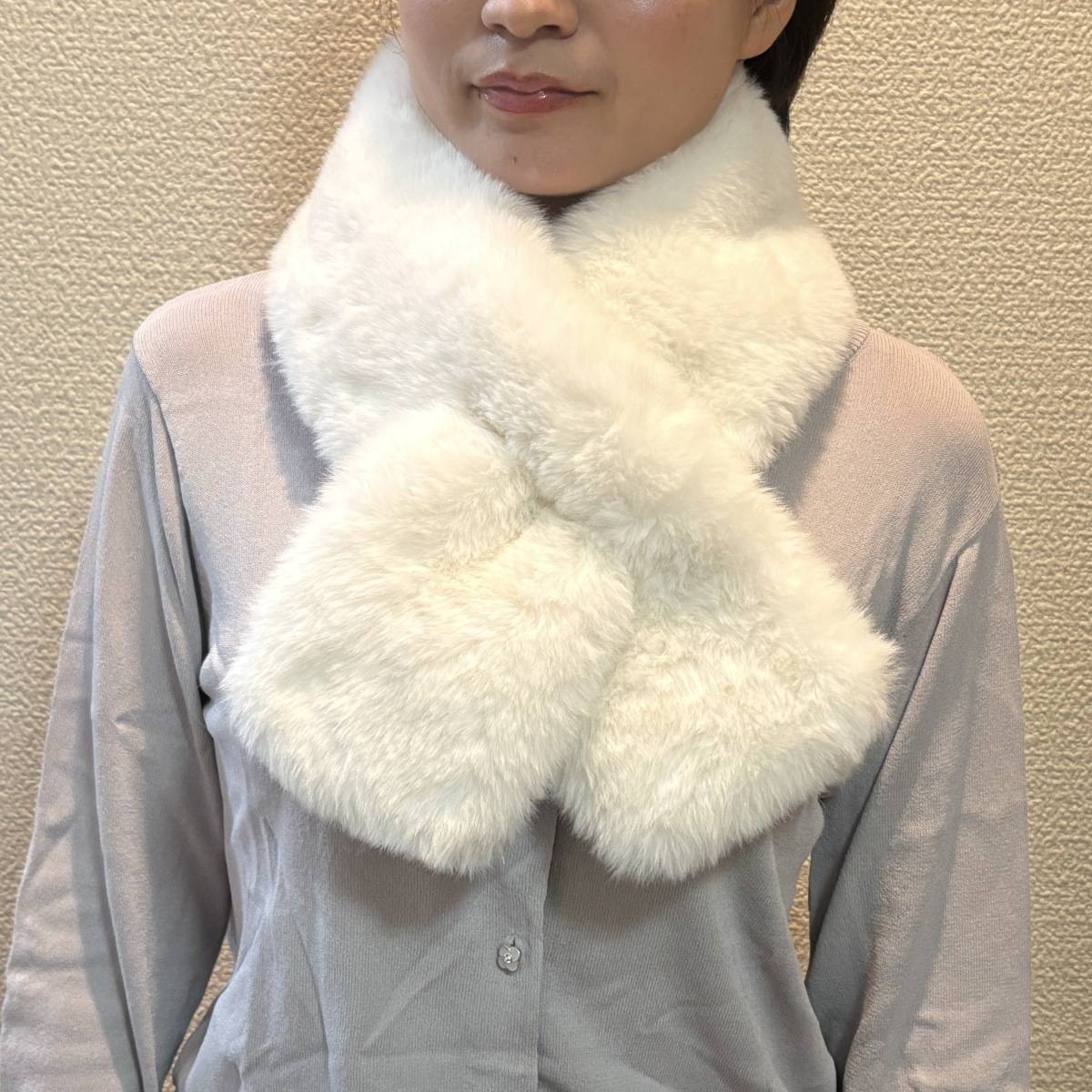 ふわふわした柔らかな肌触りで、首に巻いたときの心地よさがあります。
