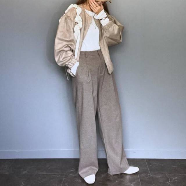 ワイドシルエットのベージュパンツは、オンオフ問わず活躍する優秀アイテム♪
