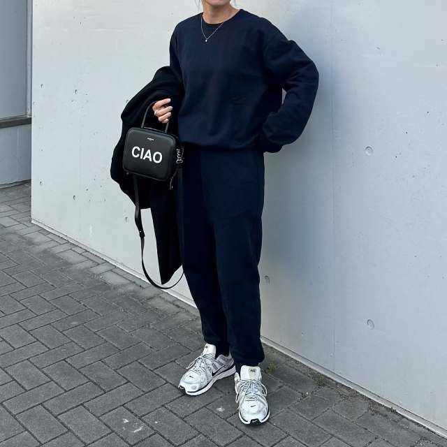 スウェットのセットアップはネイビーを、スニーカーはグレーを選ぶと、色合わせが大人っぽくてセンス抜群です♡