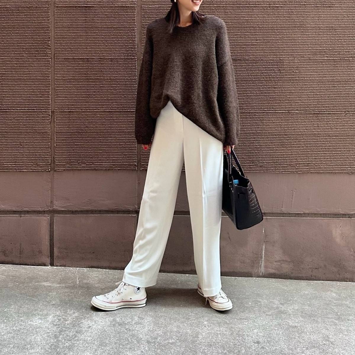 ブラウンのニットに白パンツを合わせれば、優しげで女性らしく、冬の気候によく似合うコーデが完成します♡