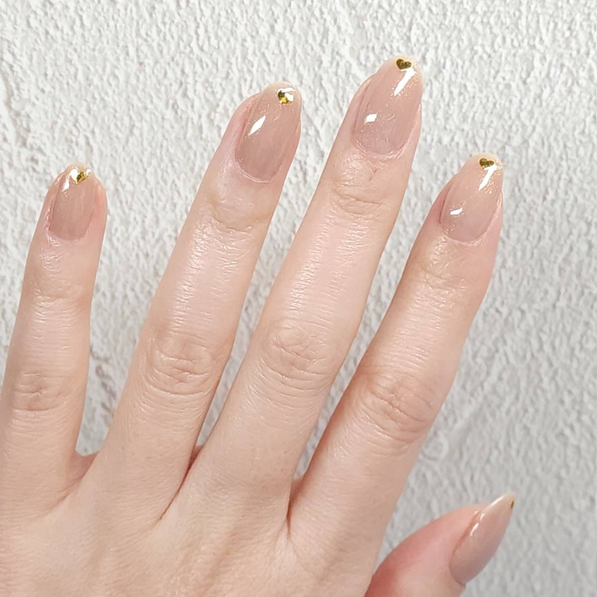 ヌーディーカラーにメタルハートが、あざと可愛い「極小ハートのジェルネイル」の完成です。