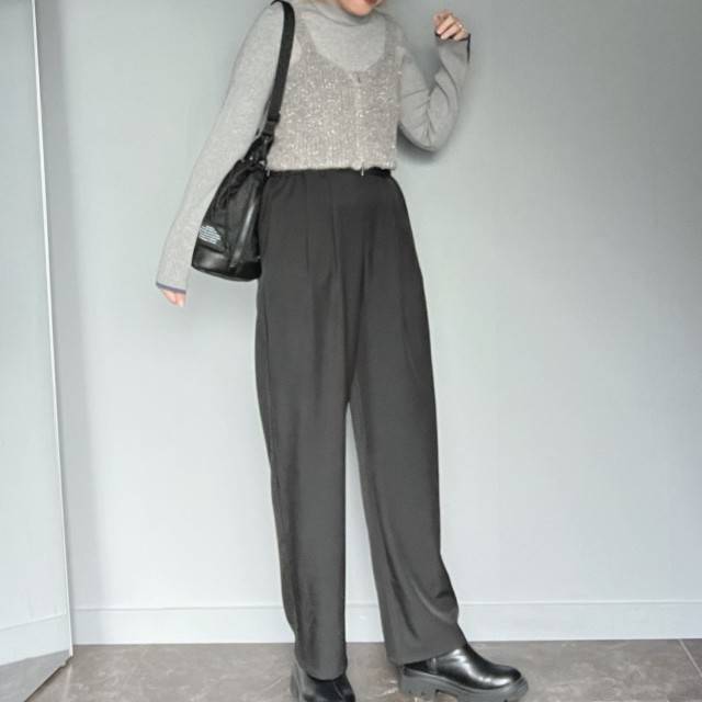 グレーのハイネックトップスと黒パンツは、冬のおでかけで着る機会が多いコーデ。