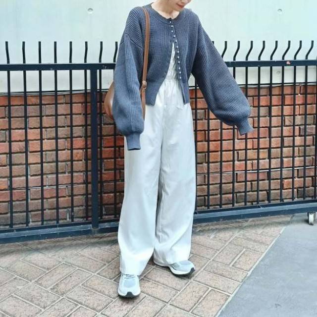白サロペットの上にグレーカーディガンを羽織れば、色合わせのバランスがよく、センスのよさを感じるコーデが完成します♡